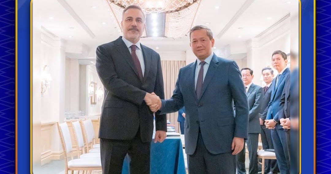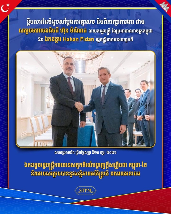 នាព្រឹកថ្ងៃទី២០ ខែកុម្ភៈ ឆ្នាំ២០២៦, សម្ដេចមហាបវរធិបតី ហ៊ុន ម៉ាណែត នាយករដ្ឋមន្ត្រីនៃព្រះរាជាណាចក្រកម្ពុជា បានអនុញ្ញាឱ្យ ឯកឧត្តម Hakan Fidan រដ្ឋមន្ត្រីការបរទេសតួកគីយ៉េចូលជួបសម្ដែងការគួរសម និងពិភាក្សាការងារ ក្នុងឱកាសនៃការអញ្ជើញដឹកនាំគណៈប្រតិភូជាន់ខ្ពស់រាជរដ្ឋាភិបាលកម្ពុជា ចូលរួមកិច្ចប្រជុំលើកដំបូងនៃក្រុមប្រឹក្សាសន្តិភាព (Board of Peace) នៅរដ្ឋធានីវ៉ាស៊ីនតោន សហរដ្ឋអាម៉េរិក។