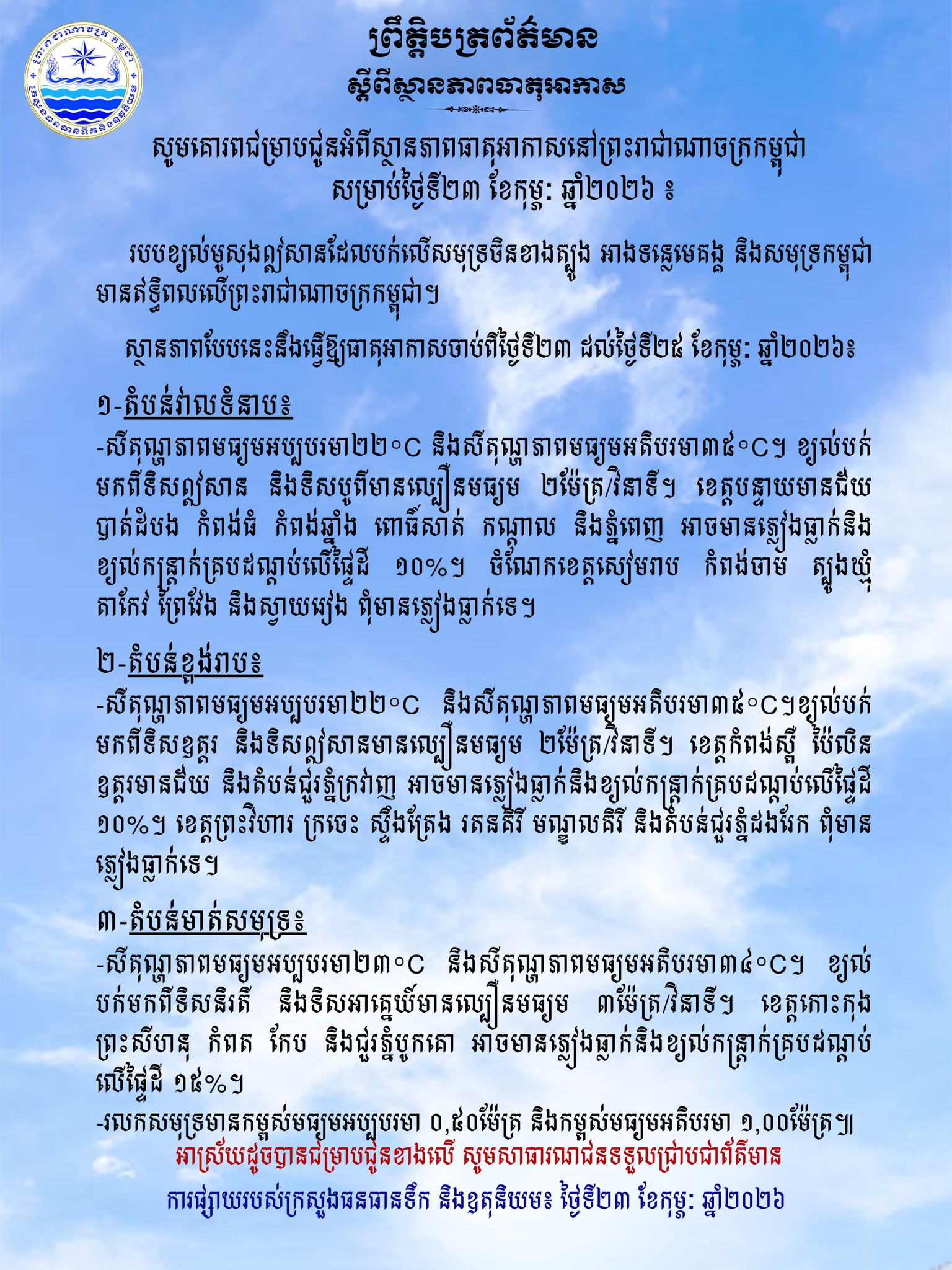 តាមរយៈព្រឹត្តិបត្រព័ត៌មានរបស់ ក្រសួងធនធានទឹក និងឧតុនិយម ពីស្ថានភាពធាតុអាកាស បានបញ្ជាក់ថា ស្ថានភាពបែបនេះនឹងធ្វើឱ្យធាតុអាកាសចាប់ពីថ្ងៃទី ២៣ ដល់ថ្ងៃទី ២៥ ខែកុម្ភៈ ឆ្នាំ ២០២៦៖