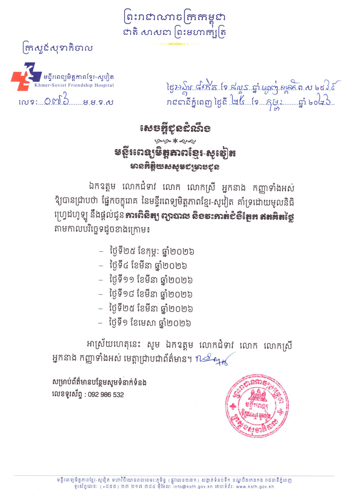 – ថ្ងៃទី ១ ខែមេសា ឆ្នាំ ២០២៦ សម្រាប់ព័ត៌មានបន្ថែមអាចធ្វើការទំនាក់ទំនងទៅកាន់លេខទូរស័ព្ទ ០៩២ ៩៨៦ ៥៣២៕