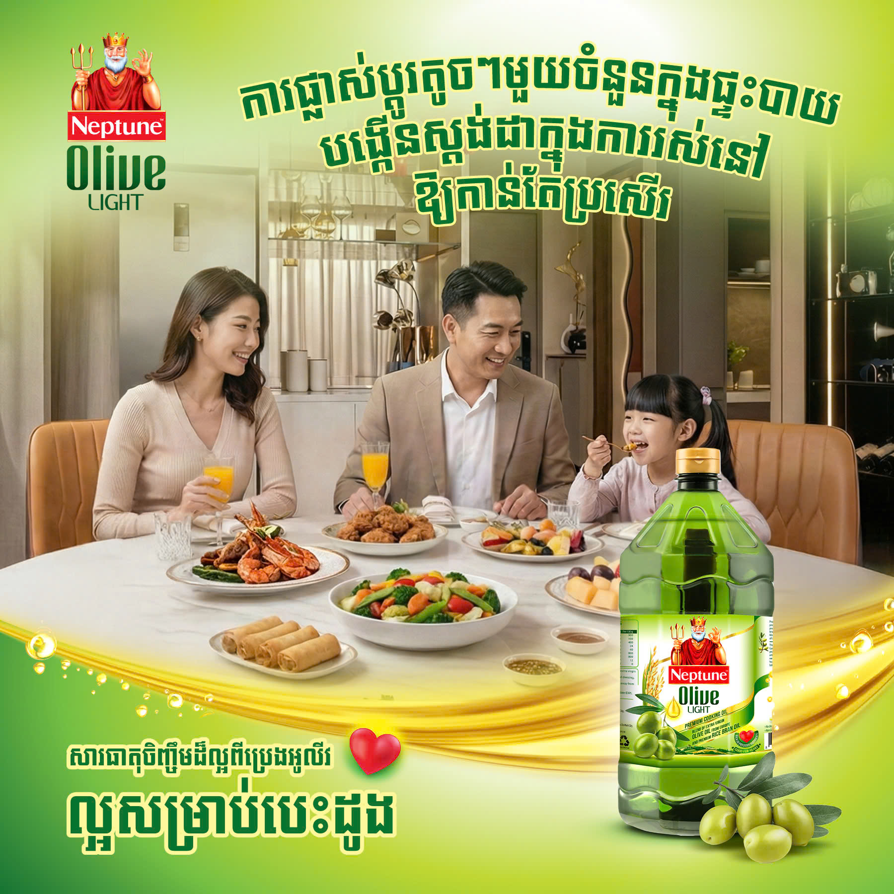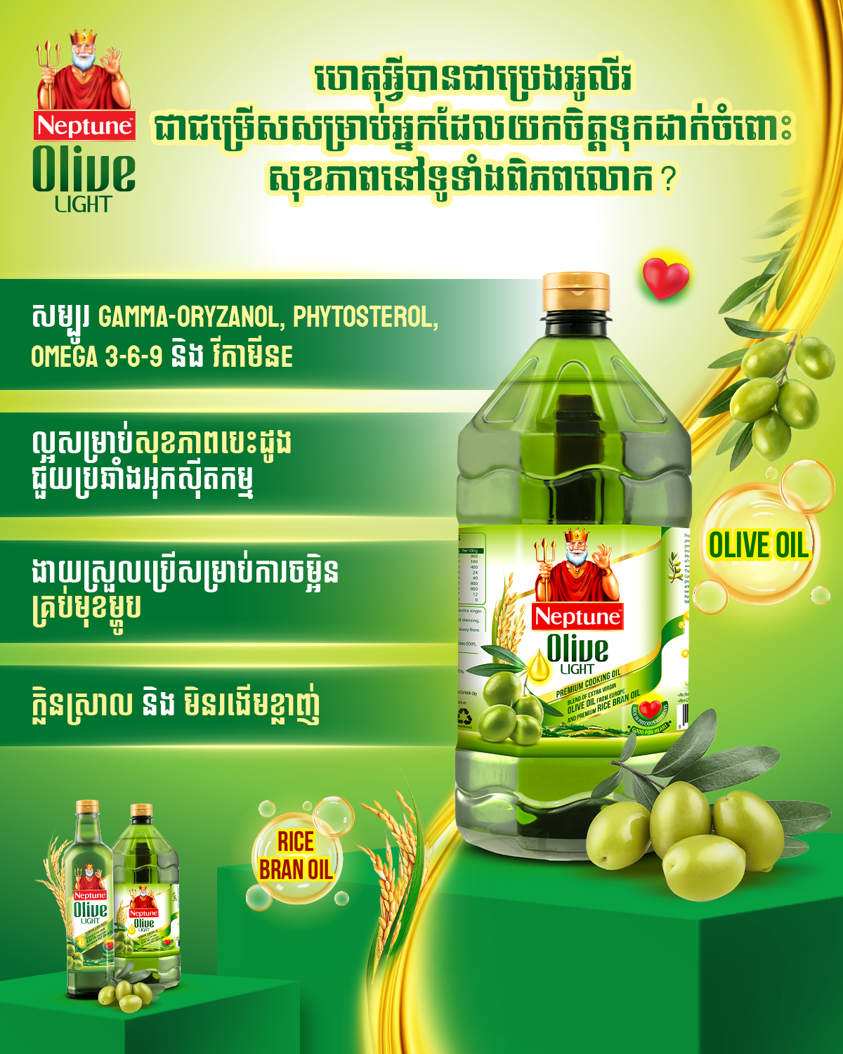 ជាមួយនឹងការបង្ហាញខ្លួននៅក្នុងប្រទេសកម្ពុជាប្រេងណិបទូនអូលីវឡាយត៍ Neptune Olive Light មិនត្រឹមតែជាផលិតផលដែលមានរូបមន្តច្នៃប្រឌិតថ្មីប៉ុណ្ណោះទេ ប៉ុន្តែថែមទាំងជាដំណោះស្រាយដ៏ល្អសម្រាប់មេផ្ទះគ្រប់រូប ក្នុងការរួមដំណើរបង្កើនគុណភាពជីវិត បណ្តុះទម្លាប់រស់នៅប្រកបដោយសុខភាពល្អ និងចូលរួមការពារសុខភាពបេះដូង ចាប់ផ្តើមពីម្ហូបអាហារនៅតាមគេហដ្ឋាន៕