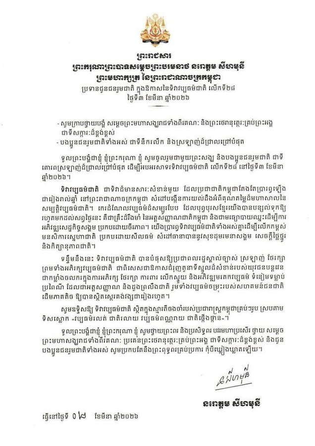 (រាជធានីភ្នំពេញ)៖ យោតាមការចុះផ្សាយរបស់ ក្រសួងព័ត៌មាន ថ្ងៃទី ៣ ខែមីនា ឆ្នាំ ២០២៦ នេះ បានឱ្យដឹងថា​ ព្រះករុណាព្រះបាទសម្តេចព្រះបរមនាថ នរោត្តម សីហមុនី ព្រះមហាក្សត្រនៃព្រះរាជាណាចក្រកម្ពុជា ព្រះអង្គបានប្រទានព្រះរាជសារជូនជនរួមជាតិ ក្នុងឱកាសនៃទិវាវប្បធម៌ជាតិ លើកទី២៨ ថ្ងៃទី ៣ ខែមីនា ឆ្នាំ ២០២៦ ហើយក្នុងព្រះរាជសារនេះ ព្រះអង្គបានចាត់ទុកថា ទិវាវប្បធម៌ជាតិនេះ គឺដើម្បីបំផុសឱ្យប្រជាពលរដ្ឋស្គាល់ច្បាស់ ស្រឡាញ់ ថែរក្សាព្រមទាំងអភិរក្សវប្បធម៌ជាតិ និងសំដៅបង្កើនការយល់ដឹងអំពីគុណ តម្លៃដ៏មហាសាលនៃសម្បត្តិវប្បធម៌ជាតិជាដើម។