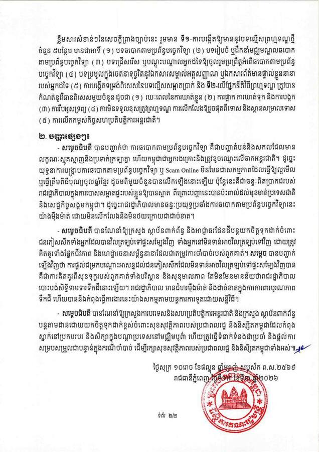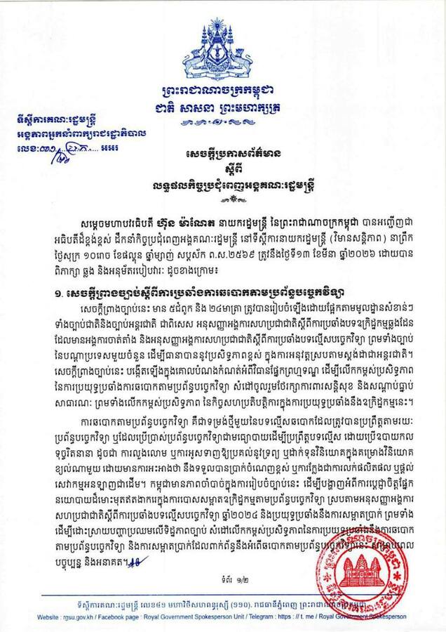 យោងតាមសេចក្តីប្រកាសព័ត៌មានស្ដីពីលទ្ធផលកិច្ចប្រជុំពេញអង្គគណៈរដ្ឋមន្ត្រី នៅថ្ងៃទី១៣ ខែមីនា ឆ្នាំ២០២៦ បានឲ្យដឹងថា នៅក្នុងកិច្ចប្រជុំ សម្តេចធិបតី ហ៊ុន ម៉ាណែត នាយករដ្ឋមន្ត្រីនៃព្រះរាជាណាចក្រកម្ពុជា បានណែនាំឱ្យក្រសួង ស្ថាប័នពាក់ព័ន្ធនិងអាជ្ញាធរដែនដីបន្តយកចិត្តទុកដាក់ចំពោះជនភៀសសឹកទាំងអ្នកដែលបានវិល ត្រឡប់ទៅផ្ទះសម្បែងវិញទាំងអ្នកនៅមិនទាន់អាចវិលត្រឡប់ទៅវិញដោយត្រូវគិតគូរទាំងផ្នែកជីវភាពនិងហេដ្ឋារចនាសម្ព័ន្ធនានាដែលជាតម្រូវការចាំបាច់របស់ពួកគាត់។