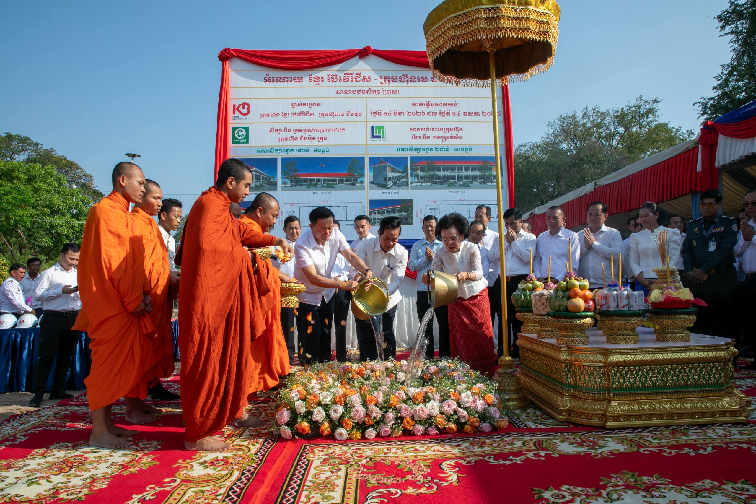 (ភ្នំពេញ)៖ ក្រោមអធិបតីភាពរបស់ឯកឧត្តម ឃួង ស្រេង អភិបាលរាជធានីភ្នំពេញ លោកអ្នកឧកញ៉ា ភាព ហៀក ស្ថាបនិកក្រុមហ៊ុន ជីប ម៉ុង និងអ្នកឧកញ៉ា លាង ម៉េង សហស្ថាបនិកក្រុមហ៊ុន ខ្មែរ ប៊ែវើរីជីស បានអញ្ជើញចូលរួមក្នុងពិធីក្រុងពាលី ជាមួយលោកគ្រូ អ្នកគ្រូ សិស្សានុសិស្ស និងមន្ត្រីរាជការជាច្រើនរូប ដើម្បីបើកការដ្ឋានសាងសង់អគារសិក្សា ១ ខ្នង កម្ពស់ ៣ ជាន់ មានចំនួន ១៥ បន្ទប់ ព្រមទាំងរបងសាលា នៅសាលាបឋមសិក្សាព្រៃស ស្ថិតនៅសង្កាត់ព្រៃស ខណ្ឌដង្កោ ដែលជាអំណោយរបស់ក្រុមហ៊ុន ខ្មែរ ប៊ែវើរីជីស ដែលជាពាណិជ្ជកម្មមួយក្រោមក្រុមហ៊ុនមេ ជីប ម៉ុង។