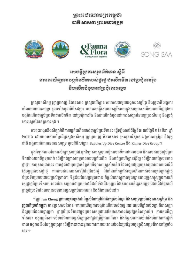 (រាជធានិភ្នំពេញ)៖ តាមការចុះផ្សាយពី ទូរទស្សន៍ជាតិកម្ពុជា ទទក នៅថ្ងៃទី ១៧ ខែមីនា ឆ្នាំ ២០២៦ នេះ បានឱ្យដឹងថា ក្រសួងកសិកម្ម រុក្ខាប្រមាញ់ និងនេសាទ ក្រសួងបរិស្ថាន សហការជាមួយអង្គការសត្វព្រៃ និងរុក្ខជាតិ អង្គការ គាំពារធនធានសមុទ្រ ព្រមទាំងមូលនិធិសង្សារ មានសេចក្តីសោមនស្សរីករាយក្នុងការប្រកាសពីការរកឃើញនូវការ បង្កកំណើតផ្កាថ្មប៉ប្រះទឹកជាលើកទី៣ នៅប្រជុំកោះរ៉ុង និងជាលើកដំបូងនៅកោះសង្សារនៃខេត្តព្រះសីហនុ និងប្រជុំ កោះស្ដេចនៃខេត្តកោះកុង។