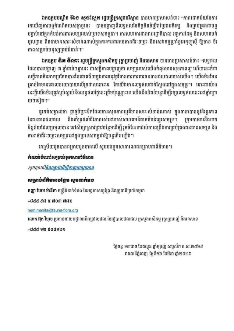 ឯកឧត្តម ឌិត ទីណា រដ្ឋមន្ត្រីក្រសួងកសិកម្ម រុក្ខាប្រមាញ់ និងនេសាទ បានមានប្រសាសន៍ថា៖ “លទ្ធផល ដែលបានបង្ហាញ ៣ ឆ្នាំជាប់ៗគ្នានេះ ជាសក្ខីភាពបង្ហាញថា សមុទ្ររបស់យើងកំពុងមានសុខភាពល្អ ហើយនេះក៏ជា សក្ខីភាពមិនអាចប្រកែកបាននៃជោគជ័យក្នុងការអនុវត្តវិធានការការពារធនធានជលផលរបស់យើង។ យើងមិនមែន គ្រាន់តែមានគោលនយោបាយលើក្រដាសនោះទេ តែយើងមានលទ្ធផលជាក់ស្តែងនៅក្នុងសមុទ្រ។ ទោះជាយ៉ាង នេះក្ដីយើងមិនត្រូវស្កប់ស្កល់នឹងលទ្ធផលថ្ងៃនេះត្រឹមប៉ុណ្ណោះទេ យើងនឹងខិតខំបន្តដើម្បីរក្សាលទ្ធផលនេះនៅឆ្នាំក្រោ យៗទៀត។”