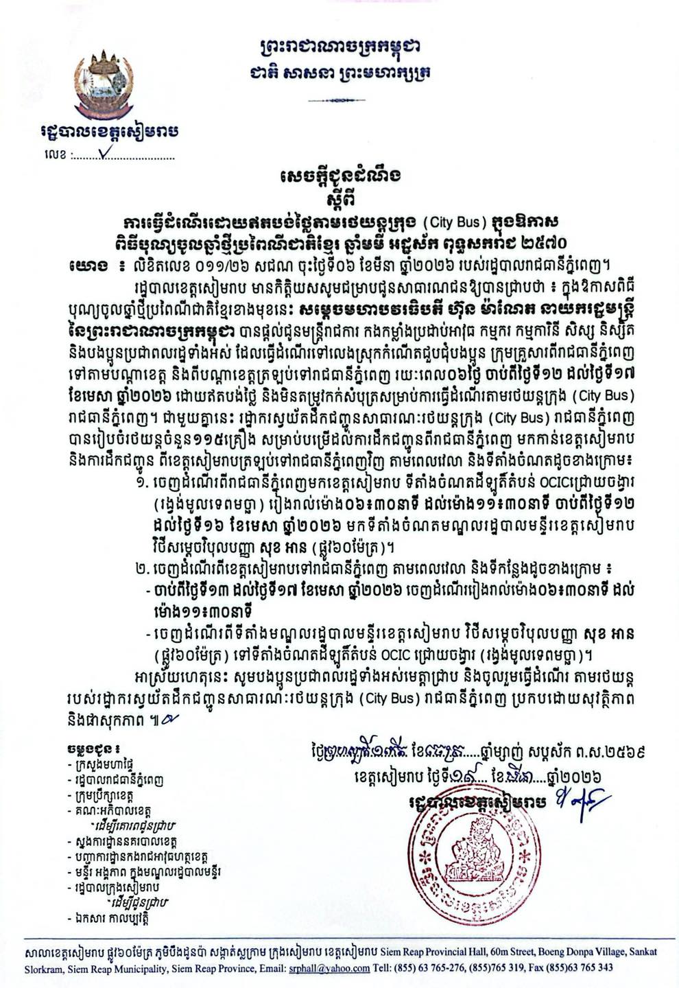 ក្នុងសេចក្ដីជូនដំណឹងរបស់ រដ្ឋបាលខេត្តសៀមរាប ក៏បានបន្ថែមទៀតថា សម្តេចមហាបវរធិបតី ហ៊ុន ម៉ាណែត បានផ្តល់ជូនមន្ត្រីរាជការ កងកម្លាំងប្រដាប់អាវុធ កម្មករ កម្មការិនី សិស្ស និស្សិត និងបងប្អូនប្រជាពលរដ្ឋទាំងអស់ ដែលធ្វើដំណើរទៅលេងស្រុកកំណើតជួបជុំបងប្អូន ក្រុមគ្រួសារពីរាជធានីភ្នំពេញ ទៅតាមបណ្តាខេត្ត និងពីបណ្តាខេត្តត្រឡប់ទៅរាជធានីភ្នំពេញ រយៈពេល ០៦ថ្ងៃ ចាប់ពីថ្ងៃទី ១២ ដល់ថ្ងៃទី ១៧ ខែមេសា ឆ្នាំ ២០២៦ ដោយឥតបង់ថ្លៃ និងមិនតម្រូវកក់សំបុត្រសម្រាប់ការធ្វើដំណើរតាមរថយន្តក្រុង (City Bus) រាជធានីភ្នំពេញ។