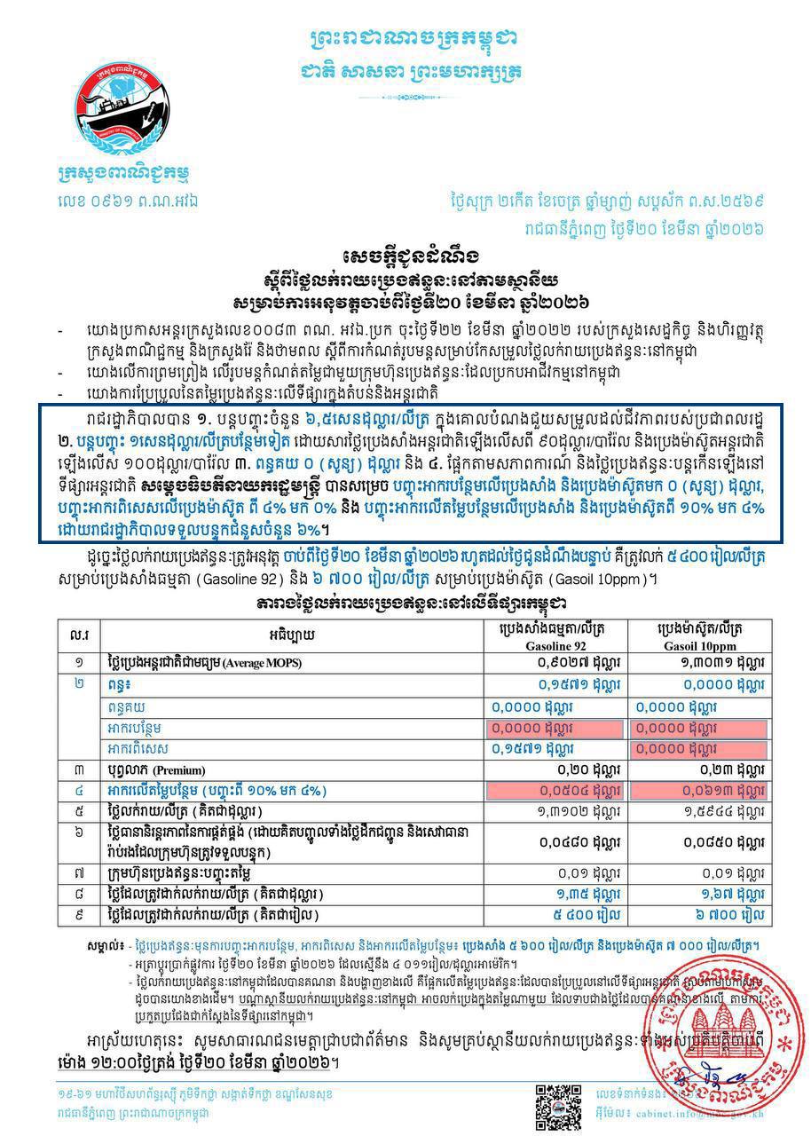 ដូច្នេះតម្លៃប្រេងឥន្ធនៈត្រូវអនុវត្តចាប់ពីថ្ងៃទី២០ ខែមីនា ឆ្នាំ២០២៦ រហូតដល់ថ្ងៃជូនដំណឹងបន្ទាប់គឺត្រូវលក់ ៥៤០ រៀល/លីត្រ សម្រាប់ប្រេងសាំងធម្មតា (gasoline 92) និង ៦៧០០ រៀល/លីត្រសម្រាប់ប្រេងម៉ាសូត (Gasoil 10ppm)៕