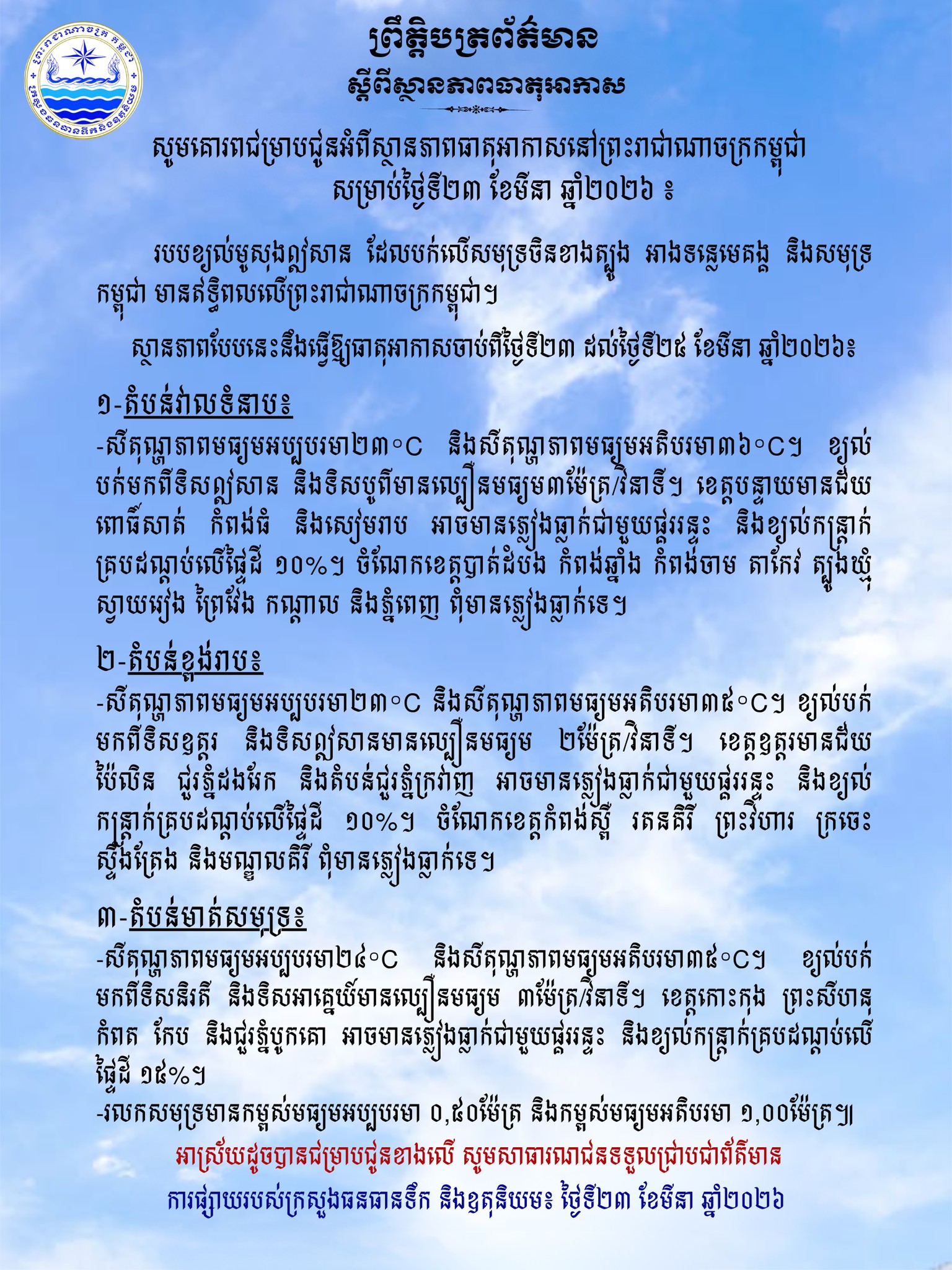 យោងតាមព្រឹត្តិបត្រព័ត៌មានរបស់ ក្រសួងធនធានទឹក និងឧតុនិយម បានបញ្ជាក់ថា ស្ថានភាពធាតុអាកាសនេះ ដោយសាររបបខ្យល់មូសុងឦសាន ដែលបក់លើសមុទ្រចិនខាងត្បូង អាងទន្លេមេគង្គ និងសមុទ្រ កម្ពុជា មានឥទ្ធិពលលើព្រះរាជាណាចក្រកម្ពុជា។ ដោយស្ថានភាពបែបនេះនឹងធ្វើឱ្យធាតុអាកាសចាប់ពីថ្ងៃទី ២៣ ដល់ថ្ងៃទី ២៥ ខែមីនា ឆ្នាំ ២០២៦។