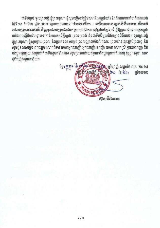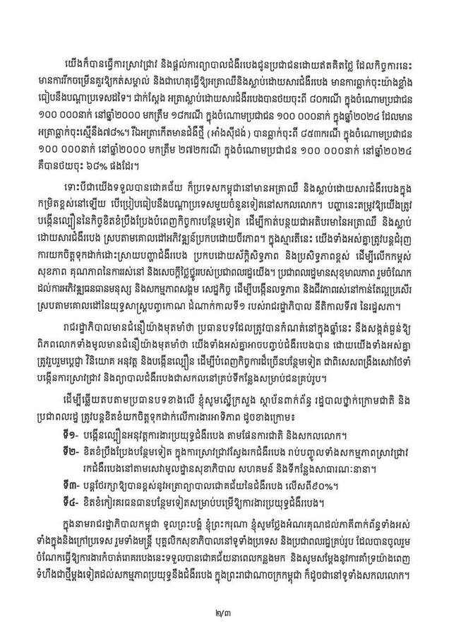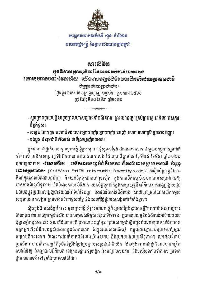 នេះបើយោងតាមសារលិខិតសម្តេចមហាបវរធិបតី ហ៊ុន ម៉ាណែត នាយករដ្ឋមន្ត្រីនៃកម្ពុជា ក្នុងឱកាសប្រារព្ធទិវាពិភពលោកកំចាត់រោគរបេង ក្រោមប្រធានបទ៖ «មែនហើយ ! យើងអាចបញ្ចប់ជំងឺរបេង៖ ដឹកនាំដោយប្រទេសជាតិ ជំរុញដោយប្រជាជន» នាថ្ងៃទី២០ ខែមីនា ឆ្នាំ២០២៦នេះ។