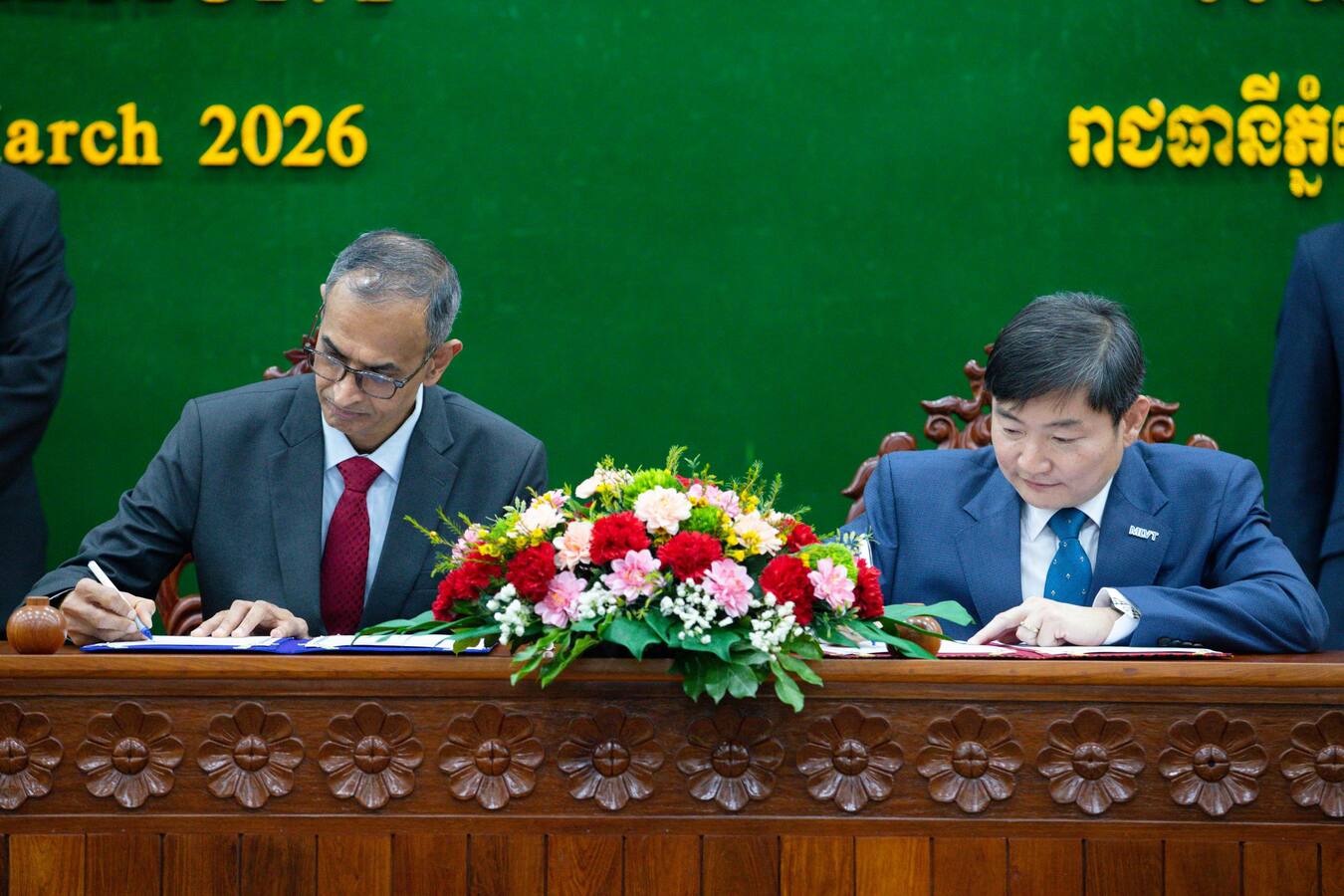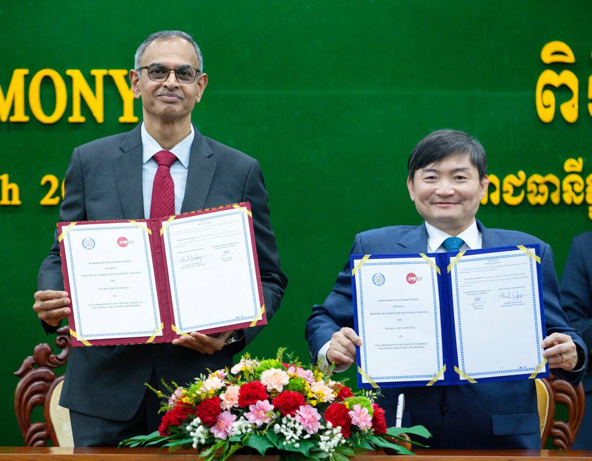 (រាជធានីភ្នំពេញ)៖ ឯកឧត្តម ហេង សួរ រដ្ឋមន្ត្រីក្រសួងការងារ និងបណ្ដុះបណ្ដាលវិជ្ជាជីវៈ បានទទួលជួបសម្តែងការគួរសម និងពិភាក្សាការងារជាមួយលោក Suresh Natarajan នាយកប្រតិបត្តិនៃវិទ្យាស្ថាន ITE Education Services (ITEES) នៅប្រទេសសិង្ហបុរី នារសៀលថ្ងៃទី២៤ ខែមីនា ឆ្នាំ២០២៦ នៅទីស្តីការក្រសួង ដែលក្នុងឱកាសនោះដែរ ភាគីទាំងពីរបានចុះហត្ថលេខាលើអនុស្សរណៈនៃការយោគយល់គ្នា (MoU) ស្តីពី “កិច្ចសហប្រតិបត្តិការលើវិស័យអប់រំបណ្ដុះបណ្ដាលបច្ចេកទេស និងវិជ្ជាជីវៈ (TVET)” ដើម្បីពង្រីកកិច្ចសហការក្នុងការលើកកម្ពស់ស្តង់ដាបណ្តុះបណ្តាលវិជ្ជាជីវៈនៅកម្ពុជាឱ្យកាន់តែមានគុណភាពពេញលេញក្នុងការឆ្លើយតបទៅនឹងតម្រូវការផ្លាស់ប្តូរឧស្សាហកម្ម និងការប្រកួតប្រជែងជាសកល។