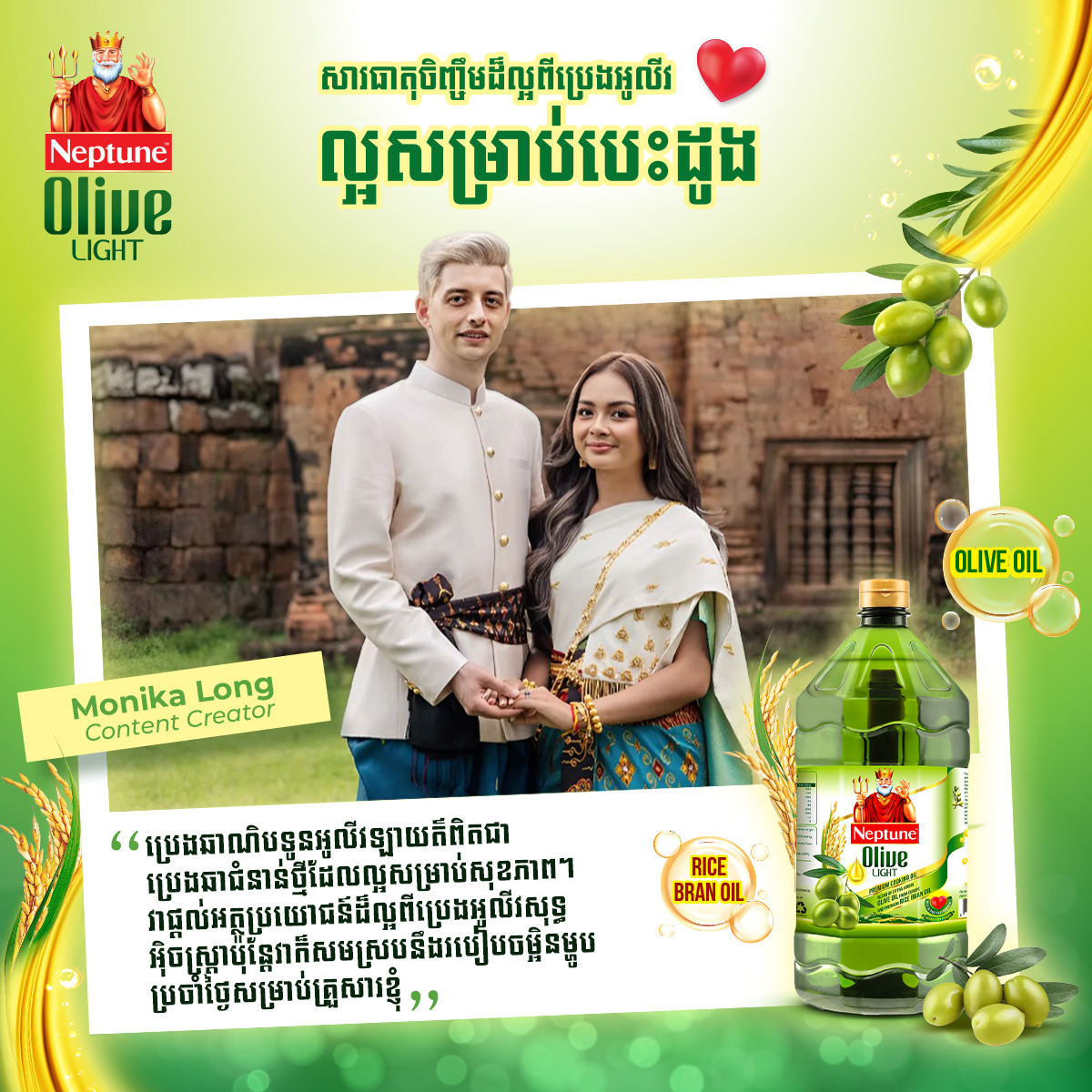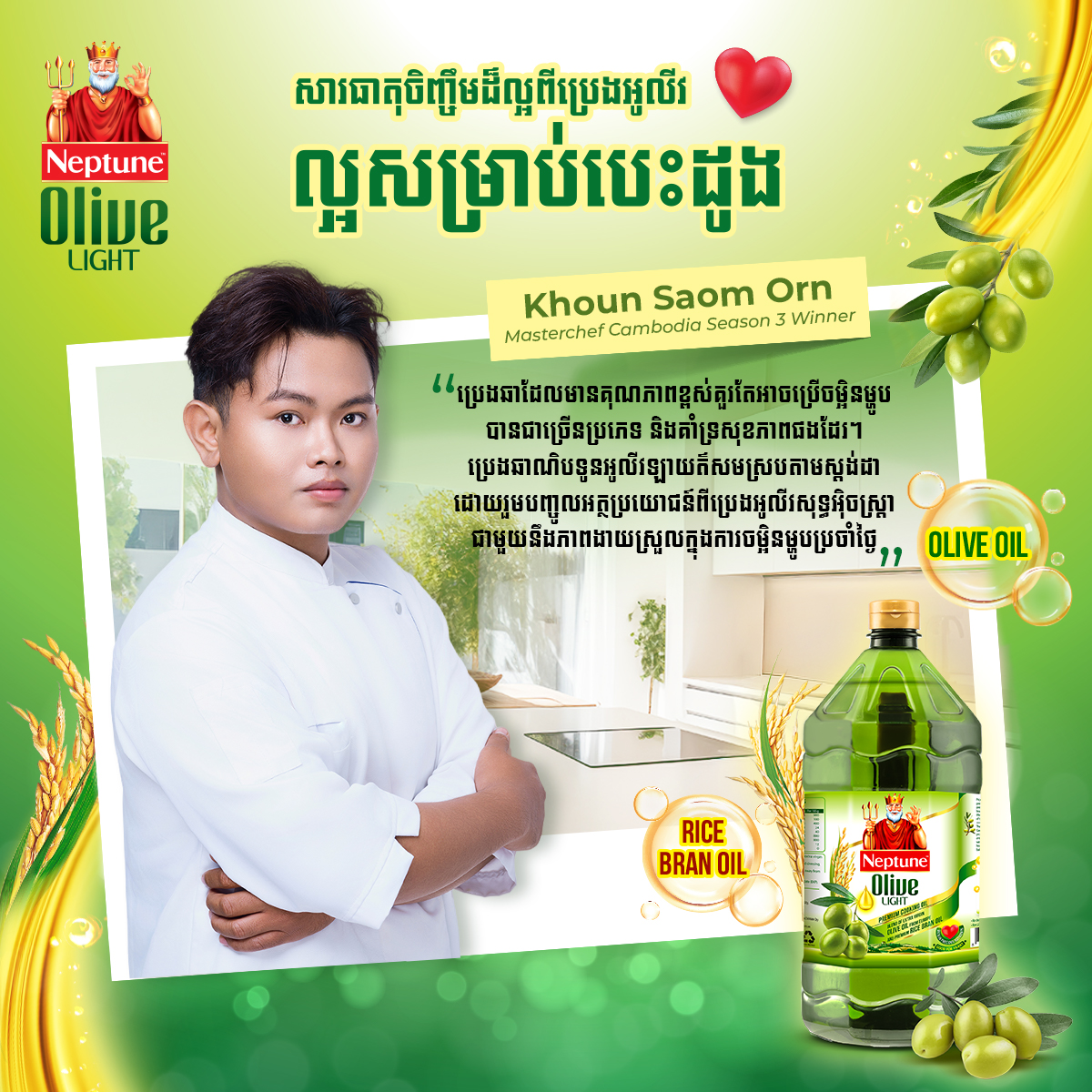 នៅពេលចោទជាសំណួរសួរថា តើជម្រើសណាមួយអាចជួយលើកកម្ពស់របៀបរស់នៅឱ្យមានសុខភាពល្អ និងល្អសម្រាប់បេះដូង លោកវេជ្ជ. និត ប៊ុនតុងយី (Dr. Tong) មេចុងភៅ Saom Orn និងគូស្វាមីភរិយា Monika Long សុទ្ធសឹងយល់ស្របថា ចម្លើយចាប់ផ្តើមពីទម្លាប់តូចៗនៅក្នុងផ្ទះបាយរៀងរាល់ថ្ងៃ ដូចជាការផ្លាស់ប្តូរគ្រឿងផ្សំមួយចំនួន ដែលយើងប្រើជាញឹកញាប់បំផុតក្នុងការចម្អិនអាហារ គឺប្រេងឆាព្រោះវាជាគ្រឿងផ្សំសំខាន់មួយនៅក្នុងអាហារប្រចាំថ្ងៃ ដែលអាចប៉ះពាល់ដល់សុខភាពក្នុងរយៈពេលវែង អ្វីដែលគួរឱ្យចាប់អារម្មណ៍នោះ អ្នកទាំង៣នាក់សុទ្ធសឹងជ្រើសរើសប្រេងអូលីវ ដើម្បីលើកកម្ពស់គុណភាពអាហារូបត្ថម្ភហើយប្រេងឆាណិបទូនអូលីវឡាយត៍ Neptune Olive Light ក្លាយជាជម្រើសដ៏ល្អមួយ