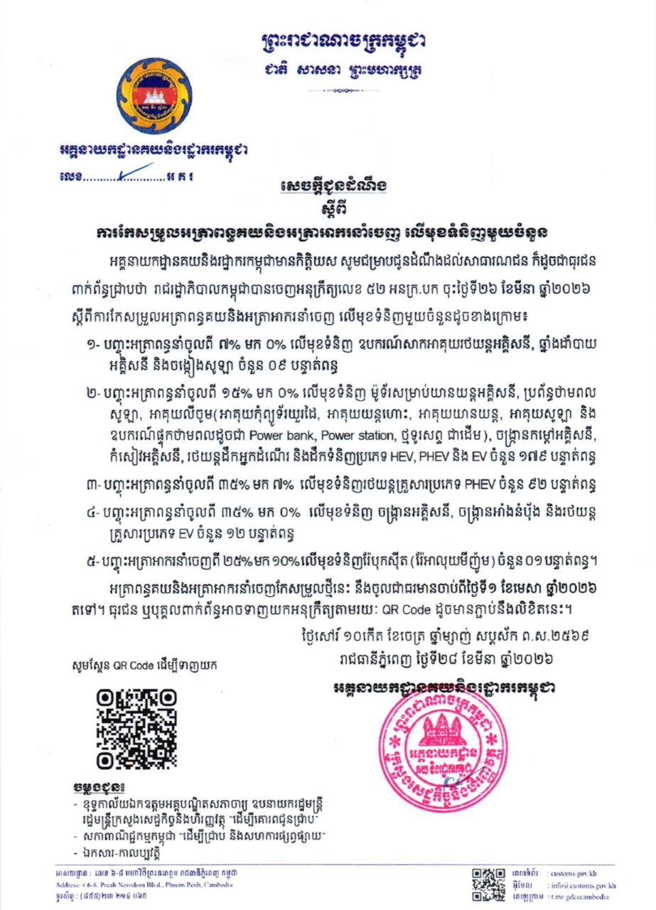 “ការកែសម្រួលអត្រាពន្ធគយនិងអត្រាអាករនាំចេញ លើមុខទំនិញមួយចំនួន អគ្គនាយកដ្ឋានគយនិងរដ្ឋាករកម្ពុជាមានកិត្តិយស សូមជម្រាបជូនដំណឹងដល់សាធារណជន ក៏ដូចជាធុរជន ពាក់ព័ន្ធជ្រាបថា រាជរដ្ឋាភិបាលកម្ពុជាបានចេញអនុក្រឹត្យលេខ ៥២ អនក្រ.បក ចុះថ្ងៃទី២៦ ខែមីនា ឆ្នាំ២០២៦ ស្ដីពីការកែសម្រួលអត្រាពន្ធគយនិងអត្រាអាករនាំចេញ លើមុខទំនិញមួយចំនួនដូចខាងក្រោម៖