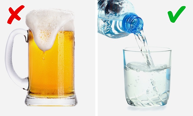 ១. ទឹក និងស្រាបៀរ ៖ ការទទួលទឹកបានគ្រប់គ្រាន់ជួយដល់រាងកាយក្នុងការបញ្ចេញចោលនូវជាតិពុលដែលបណ្ដាលឲ្យមានក្លិនខ្លួនមិនល្អ។ បើទោះបីជាការទទួលទានគ្រឿងស្រវឹង គឺប្រហែលជាវិធីល្អមួយដើម្បីសម្រាក ឬសម្រួលដល់អារម្មណ៍របស់អ្នក បន្ទាប់ពីធ្វើការហត់ពេញមួយថ្ងៃក៏ពិតមែន ប៉ុន្តែវាអាចបង្កផលអាក្រក់ដោយបង្កើតឲ្យមានក្លិនខ្លួនមិនល្អ ខណៈដែលជាតិអាល់កុលមួយចំនួនជ្រាបចេញតាមរយៈរន្ធញើសនៃរាងកាយ។