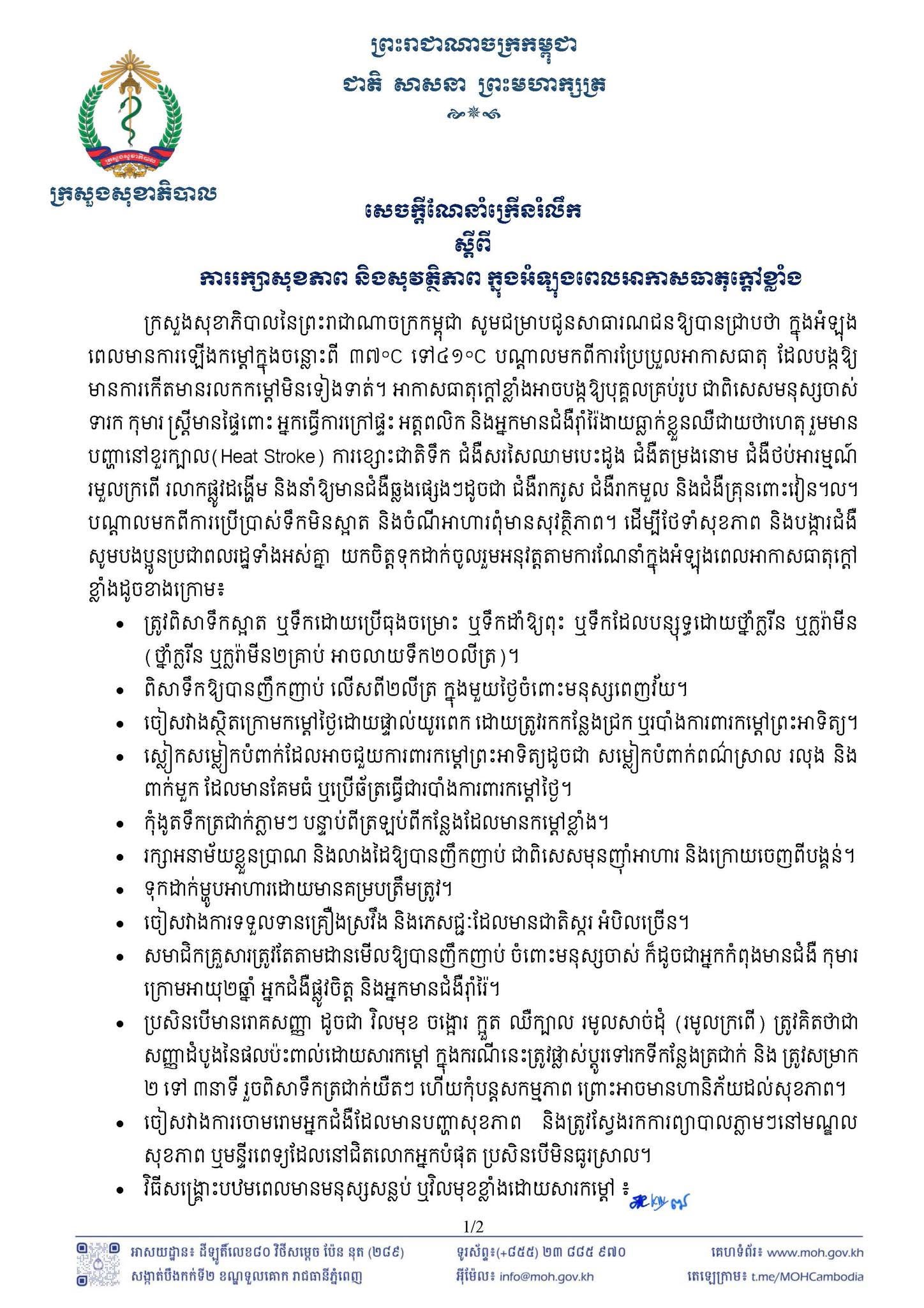 តាមរយៈសេចក្ដីណែនាំពី ក្រសួងសុខាភិបាល ជូនសាធារណជនឱ្យបានជ្រាបថា ក្នុងអំឡុង ពេលមានការឡើងកម្ដៅក្នុងចន្លោះពី ៣៧°C ទៅ៤១°C បណ្តាលមកពីការប្រែប្រួលអាកាសធាតុ ដែលបង្កឱ្យ មានការកើតមានរលកកម្ដៅមិនទៀងទាត់។ អាកាសធាតុក្តៅខ្លាំងអាចបង្កឱ្យបុគ្គលគ្រប់រូប ជាពិសេសមនុស្សចាស់ ទារក កុមារ ស្ត្រីមានផ្ទៃពោះ អ្នកធ្វើការក្រៅផ្ទះ អត្តពលិក និងអ្នកមានជំងឺរ៉ាំរ៉ៃងាយធ្លាក់ខ្លួនឈឺជាយថាហេតុ រួមមាន បញ្ហានៅខួរក្បាល (Heat Stroke) ការខ្សោះជាតិទឹក ជំងឺសរសៃឈាមបេះដូង ជំងឺតម្រងនោម ជំងឺថប់អារម្មណ៍ រមួលក្រពើ រលាកផ្លូវដង្ហើម និងនាំឱ្យមានជំងឺឆ្លងផ្សេងៗដូចជា ជំងឺរាករូស ជំងឺរាកមូល និងជំងឺគ្រុនពោះវៀន។ល។ បណ្តាលមកពីការប្រើប្រាស់ទឹកមិនស្អាត និងចំណីអាហារពុំមានសុវត្ថិភាព។ ដើម្បីថែទាំសុខភាព និងបង្ការជំងឺ សូមបងប្អូនប្រជាពលរដ្ឋទាំងអស់គ្នា យកចិត្តទុកដាក់ចូលរួមអនុវត្តតាមការណែនាំក្នុងអំឡុងពេលអាកាសធាតុក្តៅ ខ្លាំងដូចខាងក្រោម៖
