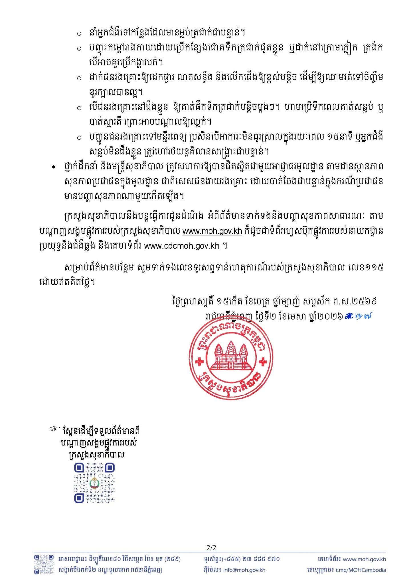 (រាជធានីភ្នំពេញ)៖ នៅថ្ងៃទី ៣ ខែមេសា ឆ្នាំ ២០២៦ នេះ ក្រសួងសុខាភិបាល ណែននាំ និងក្រើនរំលឹងដល់ពលរដ្ឋ ឱ្យថែរក្សា សុវត្ថិភាព ក្នុងអំឡុងពេល ដែលអកាសធាតុក្ដៅអាចឡើងក្នុងចន្លោះពី ៣៧°C ទៅ៤១°C។