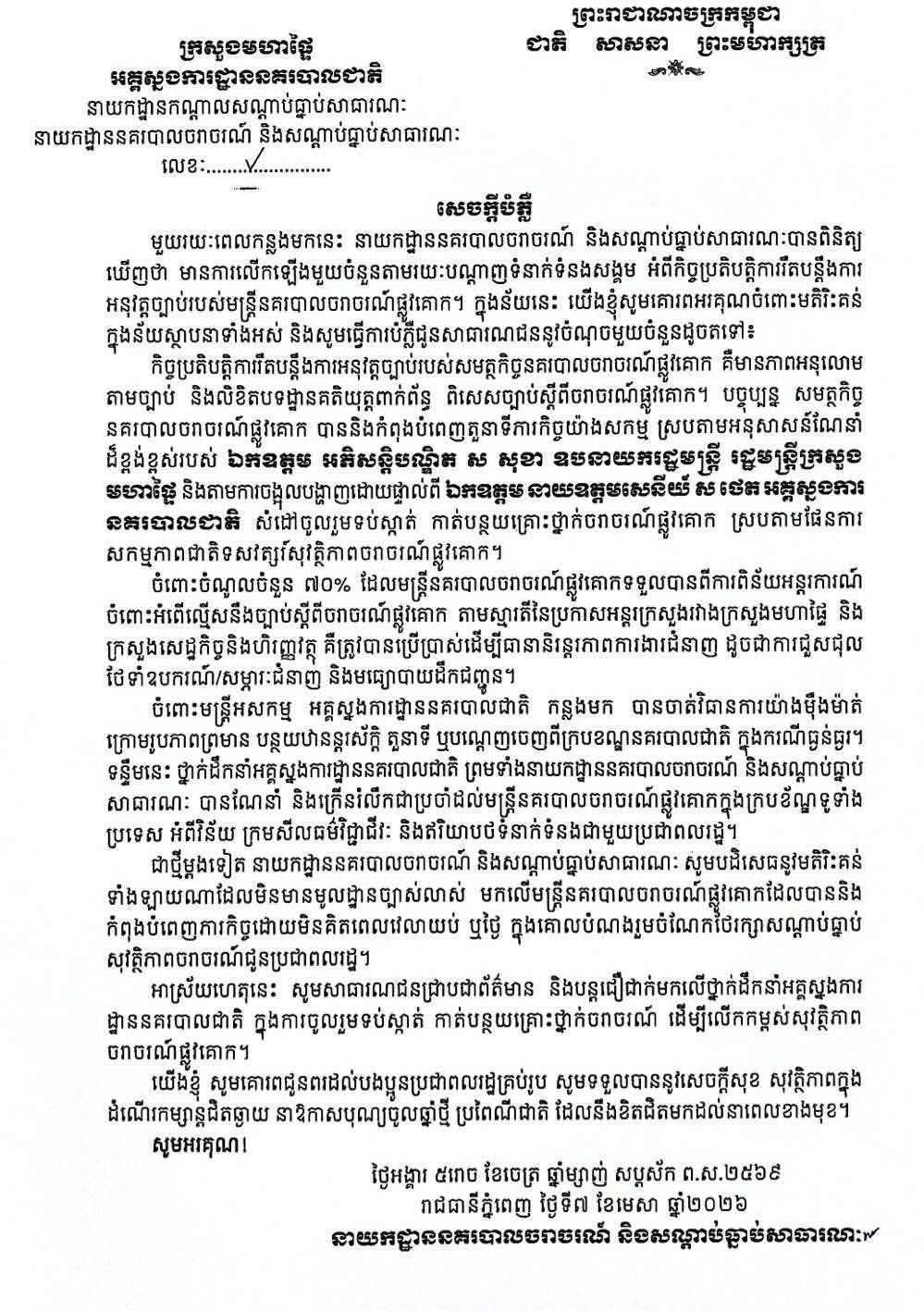 នាថ្ងៃទី ៧ ខែមេសា ឆ្នាំ ២០២៦ នេះ នាយកដ្ឋាននគរបាលចរាចរណ៍ និងសណ្ដាប់ធ្នាប់សាធារណៈ បំភ្លឺថា ចំណូលចំនួន ៧០% ដែលមន្ត្រីនគរបាលចរាចរណ៍ផ្លូវគោកទទួលបានពីការពិន័យ គឺត្រូវបានប្រើប្រាស់ដើម្បីធានានិរន្តរភាពការងារជំនាញ ដូចជា ការជួសជុល ថែទាំឧបករណ៍/សម្ភារៈជំនាញ និងមធ្យោបាយដឹកជញ្ជូន។
