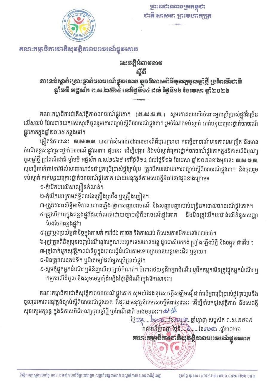 ឆ្លៀតឱកាសនេះ គ.ស.ច.គ. បានកត់សំគាល់នៅពេលមានពិធីបុណ្យនានា ការធ្វើចរាចរណ៍មានភាពមមាញឹក និងមាន កំណើនខ្ពស់នូវគ្រោះថ្នាក់ចរាចរណ៍ផ្លូវគោក។ ដូចនេះ ដើម្បីបង្ការ និងទប់ស្កាត់គ្រោះថ្នាក់ចរាចរណ៍ផ្លូវគោកក្នុងឱកាសពិធីបុណ្យ ចូលឆ្នាំថ្មី ប្រពៃណីជាតិ ឆ្នាំមមី អដ្ឋស័ក ព.ស.២៥៦៩ នៅថ្ងៃទី ១៤ ដល់ថ្ងៃទី ១៦ ខែមេសា ឆ្នាំ ២០២៦ ខាងមុខនេះ គ.ស.ច.គ. សូមធ្វើការអំពាវនាវដល់សាធារណជនជាអ្នកប្រើប្រាស់ផ្លូវគ្រប់រូប ត្រូវបើកបរដោយគោរពច្បាប់ស្តីពីចរាចរណ៍ផ្លូវគោក និងចូលរួម ទប់ស្កាត់ កាត់បន្ថយគ្រោះថ្នាក់ចរាចរណ៍ផ្លូវគោក ដោយអនុវត្តន៍តាមសេចក្តីអំពាវនាវដូចខាងក្រោម៖