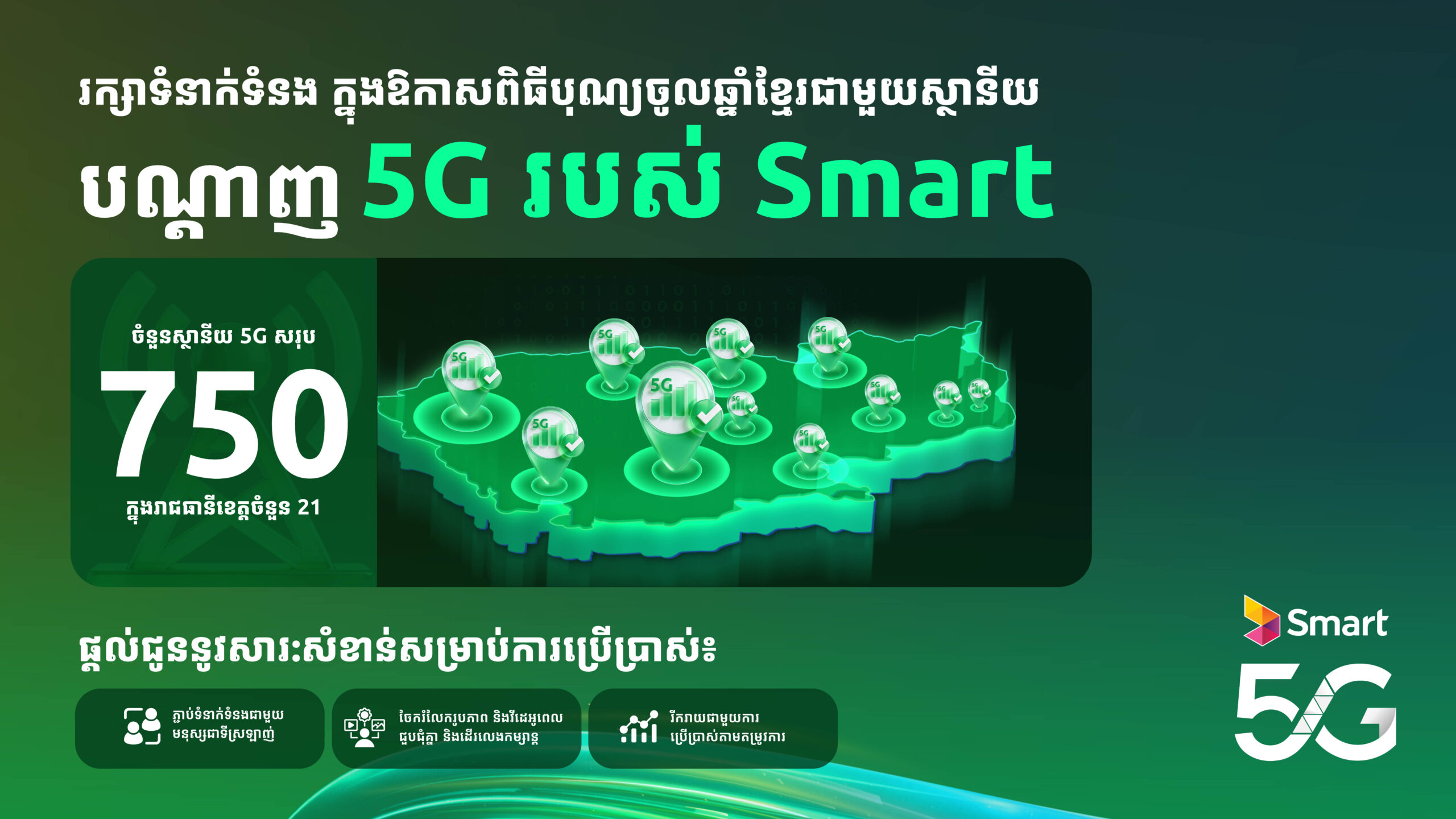 នៅពេលដែលប្រជាជនកម្ពុជារាប់លាននាក់ត្រៀមខ្លួនធ្វើដំណើរ ជួបជុំក្រុមគ្រួសារ និងចូលរួមក្នុងកម្មវិធីអបអរសាទរនៅទូទាំងប្រទេស ក្នុងឱកាសពិធីបុណ្យចូលឆ្នាំថ្មីប្រពៃណីជាតិខ្មែរ ក្រុមហ៊ុន Smart Axiata បានពង្រឹង បណ្ដាញ 5G របស់ខ្លួន ដោយបានដំឡើងស្ថានីយ 5G សរុបចំនួន 750 ក្នុង 21 ខេត្តក្រុង ព្រមទាំងដាក់ចេញនូវគម្រោងថ្មីគឺ ‘Smart ដាតា តាមចិត្ត!’ ដើម្បីផ្តល់នូវការភ្ជាប់ទំនាក់ទំនងកាន់តែរលូន និងគួរឱ្យទុកចិត្តបំផុត នៅតាមទីកន្លែងដែលប្រជាពលរដ្ឋដើរកម្សាន្ត និងធ្វើដំណើរ។