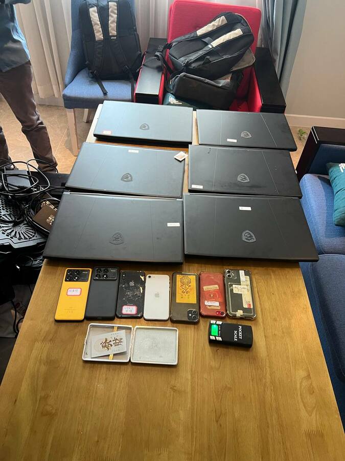 ក្នុងប្រតិបត្តិការនេះសមត្ថកិច្ចបានរកឃើញសម្ភារៈបច្ចេកទេសជាច្រើនដែលបម្រើឱ្យសកម្មភាពឆបោក រួមមានទូរសព្ទដៃចំនួន ៦១៥ គ្រឿង, Laptop ១៤០ គ្រឿង, All in One ៣១ គ្រឿង, Monitor ៦ គ្រឿង និង CPU ៣ គ្រឿង។ សមត្ថកិច្ចបានរឹបអូសសម្ភារៈទាំងនេះសម្រាប់ជាភស្តុតាងក្នុងការកសាងសំណុំរឿង និងការអនុវត្តនីតិវិធីច្បាប់។