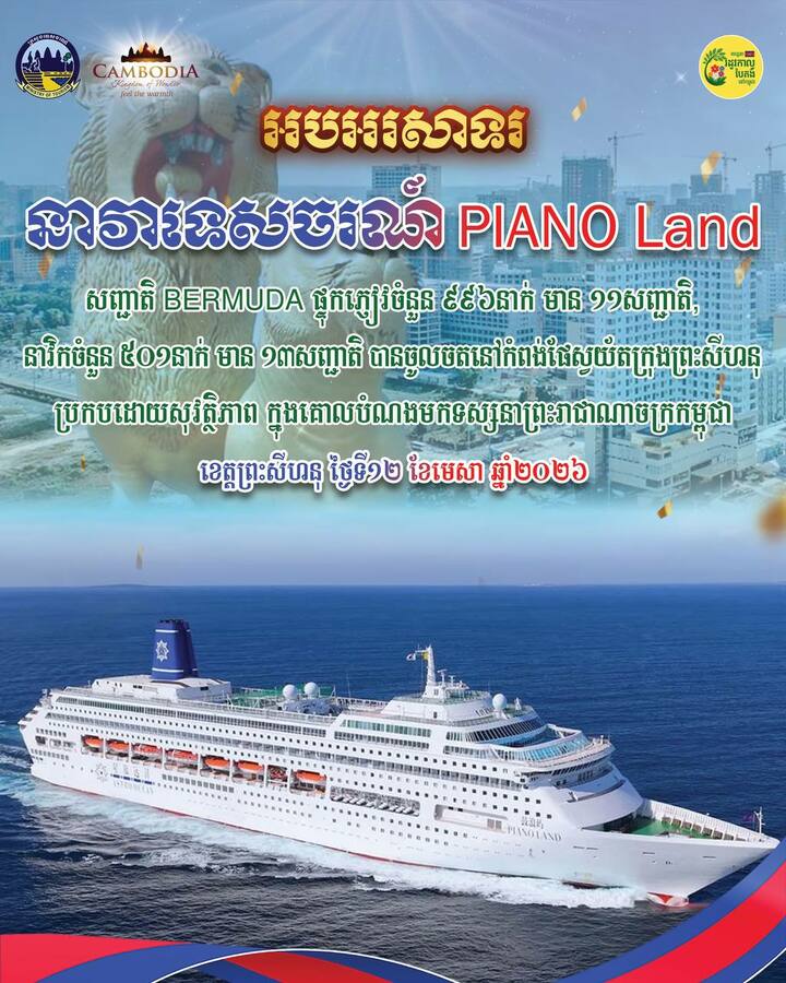 (ខេត្តព្រះសីហនុ)៖ នៅថ្ងៃទី១២ ខែមេសា ឆ្នាំ២០២៦ នេះ កម្ពុជាបានបន្តបញ្ជាក់យ៉ាងច្បាស់ពីសក្តានុពលរបស់ខ្លួនជា «គោលដៅទេសចរណ៍សុវត្ថិភាព និងជាទឹកដីដ៏សែនមនោរម្យ» សម្រាប់ភ្ញៀវទេសចរទូទាំងសកលលោក បន្ទាប់ពីនាវាទេសចរណ៍ខ្នាតយក្សឈ្មោះ PIANO LAND បានចូលចតនៅកំពង់ផែស្វយ័តក្រុងព្រះសីហនុដោយរលូន និងសុវត្ថិភាព។