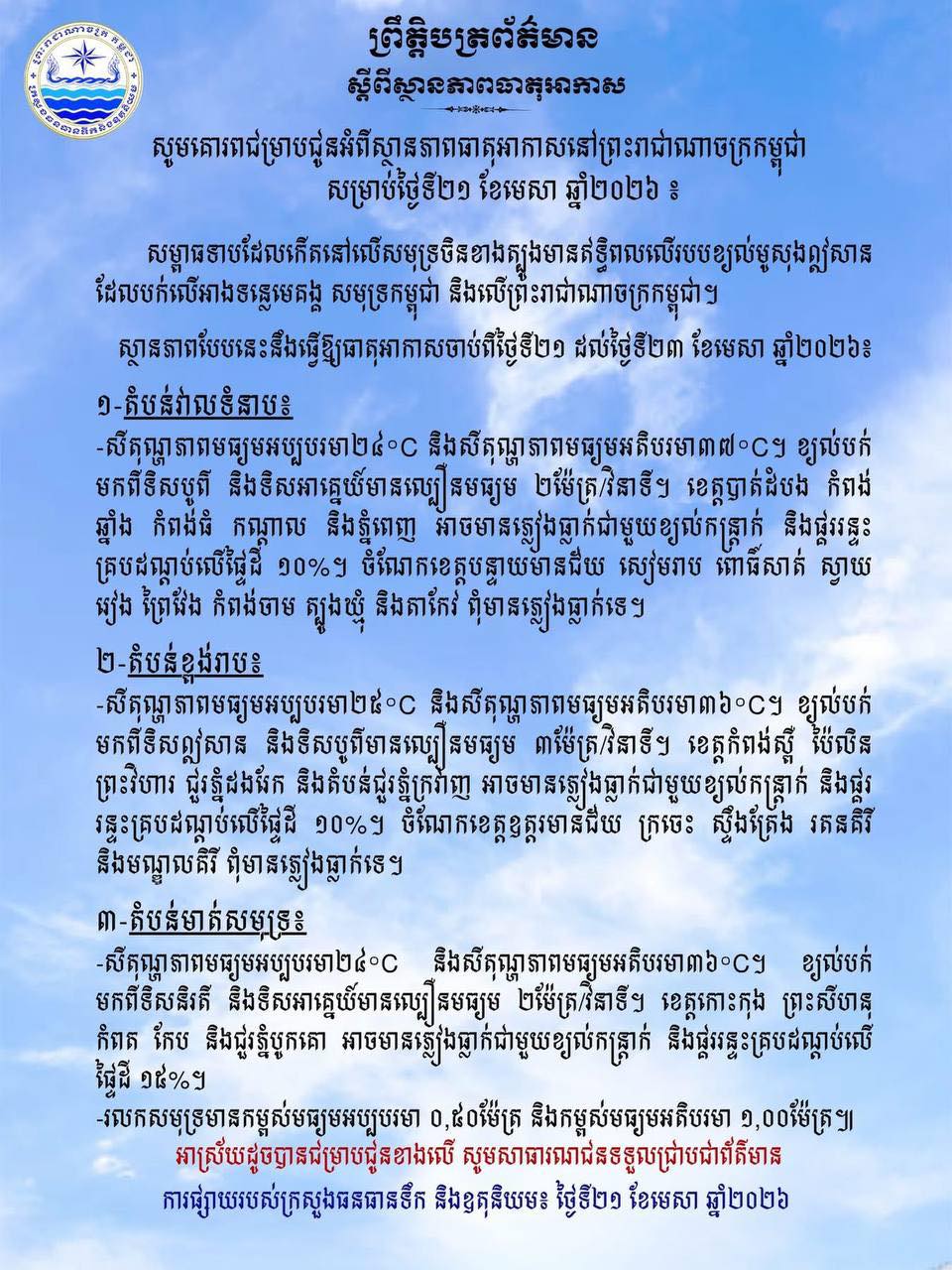 តាមរយៈព្រឹត្តិបត្រព័ត៌មានពីស្ថានភាពធាតុអាកាស នៅក្នុងប្រទេសកម្ពុជា សម្រាប់ថ្ងៃទី ២១ ខែមេសា ឆ្នាំ ២០២៦ សម្ពាធទាបដែលកើតនៅលើសមុទ្រចិនខាងត្បូងមានឥទ្ធិពលលើរបបខ្យល់មូសុងឦសាន ដែលបក់លើអាងទន្លេមេគង្គ សមុទ្រកម្ពុជា និងលើព្រះរាជាណាចក្រកម្ពុជា។