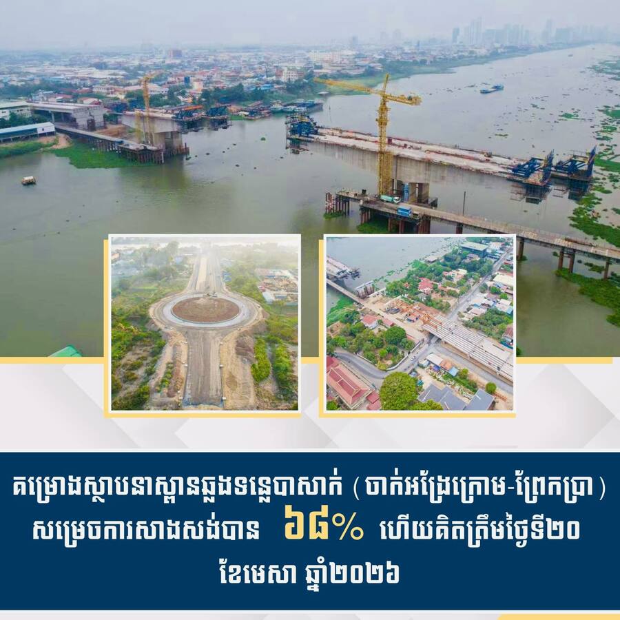 គម្រោងស្ថាបនាស្ពានឆ្លងទន្លេបាសាក់ (ចាក់អង្រែក្រោម-ព្រែកប្រា) សម្រេចការសាងសង់បាន ៦៨% ហើយ គិតត្រឹមថ្ងៃទី២០ ខែមេសា ឆ្នាំ២០២៦