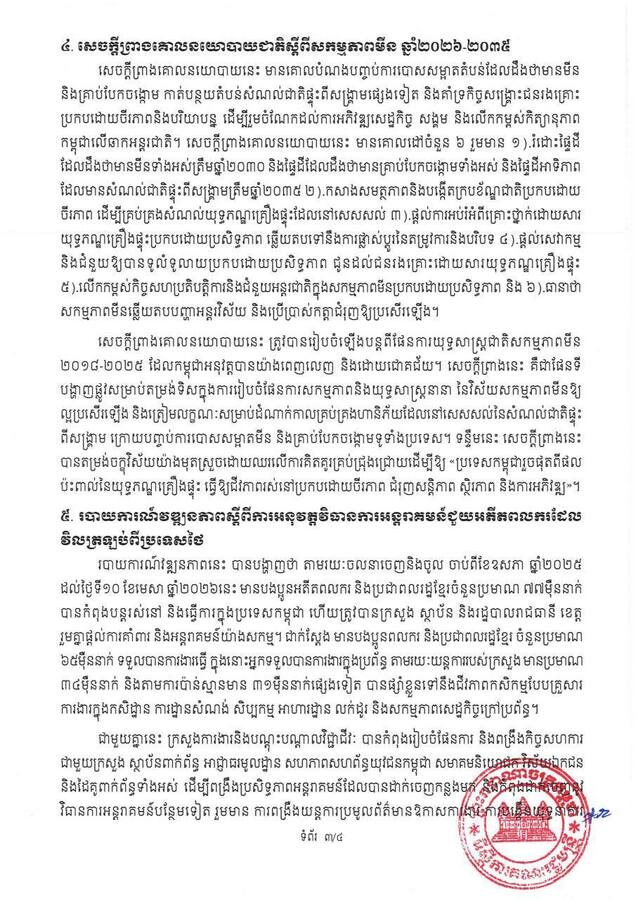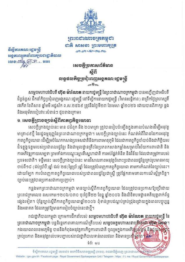 (រាជធានីភ្នំពេញ)៖ យោងតាមការចុះផ្សាយរបស់ ក្រសួងព័ត៌មាន កាលពីល្ងាចថ្ងៃទី ២៤ ខែមេសា ឆ្នាំ ២០២៦ បានឱ្យដឹងថា គណៈរដ្ឋមន្ត្រីកម្ពុជា ស្នើឱ្យច្បាប់ស្តីពីកាតព្វកិច្ចយោធា ត្រូវប្រកាសជាការប្រញាប់។