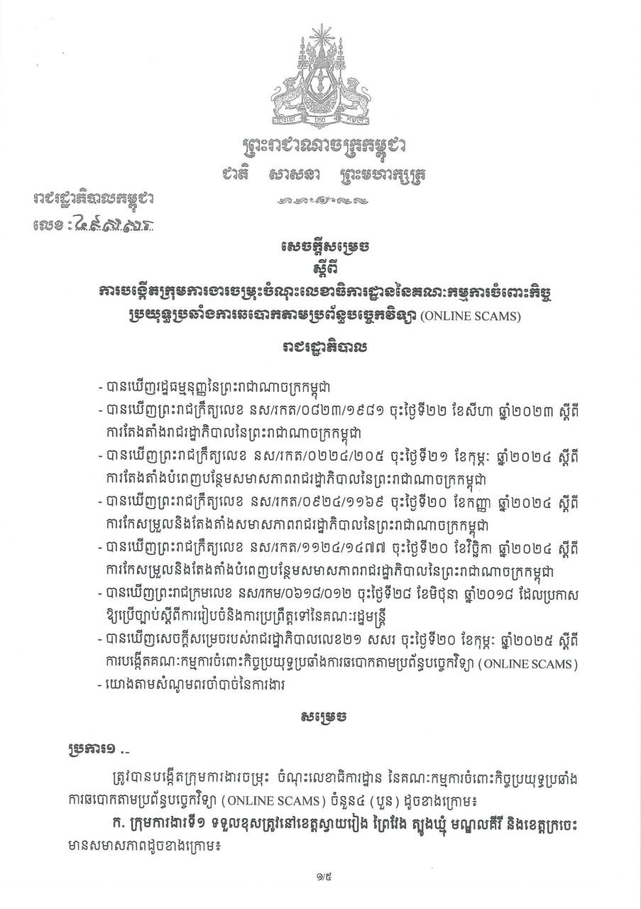 រាជរដ្ឋាភិបាលកម្ពុជា បង្កើតក្រុមការងារចម្រុះចំណុះលេខាធិការដ្ឋាន គ.ប.ឆ.ប. ដើម្បីបង្កើនប្រសិទ្ធភាពបង្ក្រាប និងបោសសម្អាតការឆបោកតាមប្រព័ន្ធបច្ចេកវិទ្យា