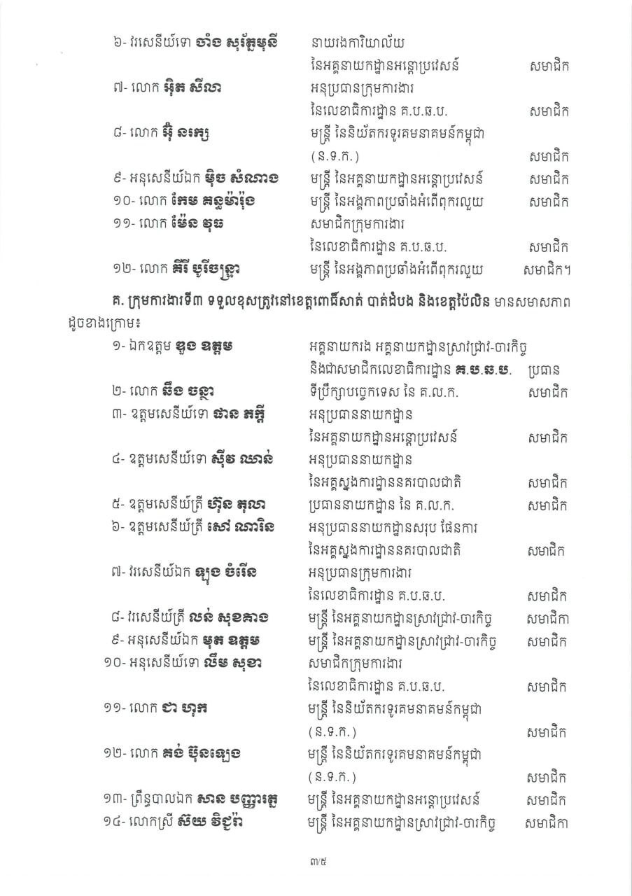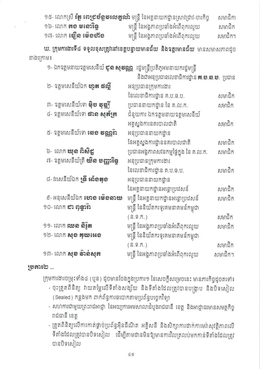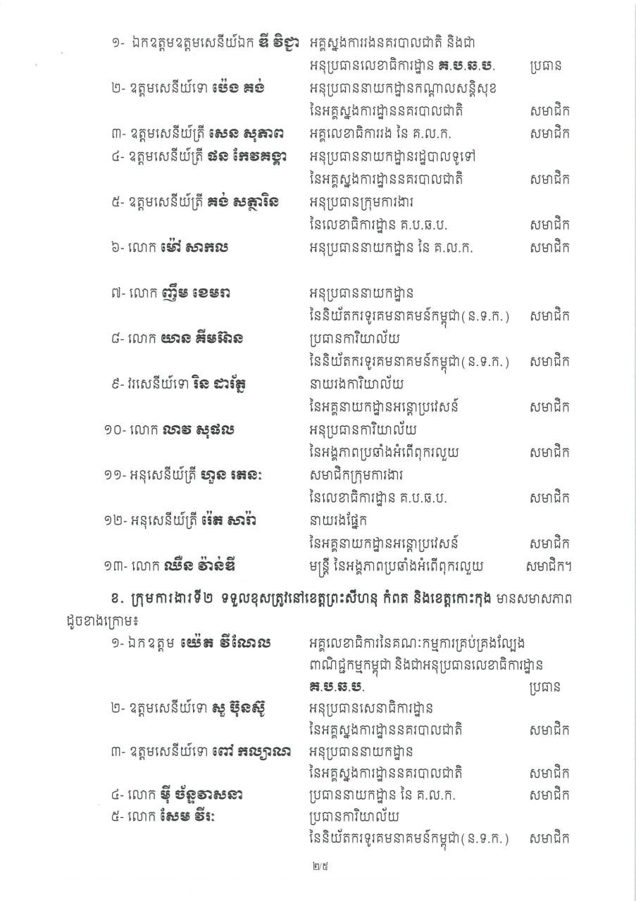 ក្រុមការងារទី១៖ ទទួលខុសត្រូវខេត្តស្វាយរៀង ព្រៃវែង ត្បូងឃ្មុំ មណ្ឌលគីរី និងក្រចេះ ដឹកនាំដោយ ឯកឧត្តម ឌី វិជ្ជា ។ ក្រុមការងារទី២៖ ទទួលខុសត្រូវខេត្តព្រះសីហនុ កំពត និងកោះកុង ដឹកនាំដោយ ឯកឧត្តម យ៉េត វីណែល ។ ក្រុមការងារទី៣៖ ទទួលខុសត្រូវខេត្តពោធិ៍សាត់ បាត់ដំបង និងប៉ៃលិន ដឹកនាំដោយ ឯកឧត្តម ឌួង ឧត្តម ។ ក្រុមការងារទី៤៖ ទទួលខុសត្រូវខេត្តបន្ទាយមានជ័យ និងឧត្តរមានជ័យ ដឹកនាំដោយ ឯកឧត្តម ជួន សុវណ្ណ ។