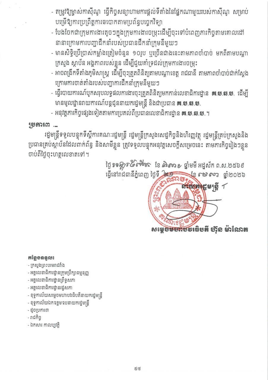 ក្រុមការងារនីមួយៗមានភារកិច្ចស្នូលរួមមាន៖ ចុះពិនិត្យទីតាំងសង្ស័យ និងទីតាំងដែលធ្លាប់បានបង្ក្រាប ឬបិទសៀល (Sealed) នាពេលកន្លងមក ដើម្បីការពារកុំឱ្យមានការលួចលាក់បើកដំណើរការឡើងវិញ ។ ត្រួតពិនិត្យលើការកាត់ផ្តាច់ប្រព័ន្ធអ៊ីនធឺណិត អគ្គិសនី និងសិក្សាការបំពាក់កាមេរ៉ាសុវត្ថិភាពដើម្បីតាមដាន ។ តម្រូវឱ្យម្ចាស់កាស៊ីណូធ្វើកិច្ចសន្យាហាមដាច់ខាតការផ្តល់ទីតាំងសម្រាប់បម្រើឱ្យការឆបោកតាមប្រព័ន្ធបច្ចេកវិទ្យា ។ ធ្វើការជិតស្និទ្ធជាមួយព្រះរាជអាជ្ញា និងអាជ្ញាធរដែនដី ហើយមានសិទ្ធិប្រើប្រាស់កម្លាំងត្រៀមពីតាមក្រសួង-ស្ថាប័នពាក់ព័ន្ធចំនួន ១០រូប ឬច្រើនជាងនេះតាមភាពចាំបាច់។ សេចក្តីសម្រេចនេះត្រូវបានចុះហត្ថលេខា និងចូលជាធរមានចាប់ពីថ្ងៃទី ២១ ខែមេសា ឆ្នាំ ២០២៦ តទៅ។