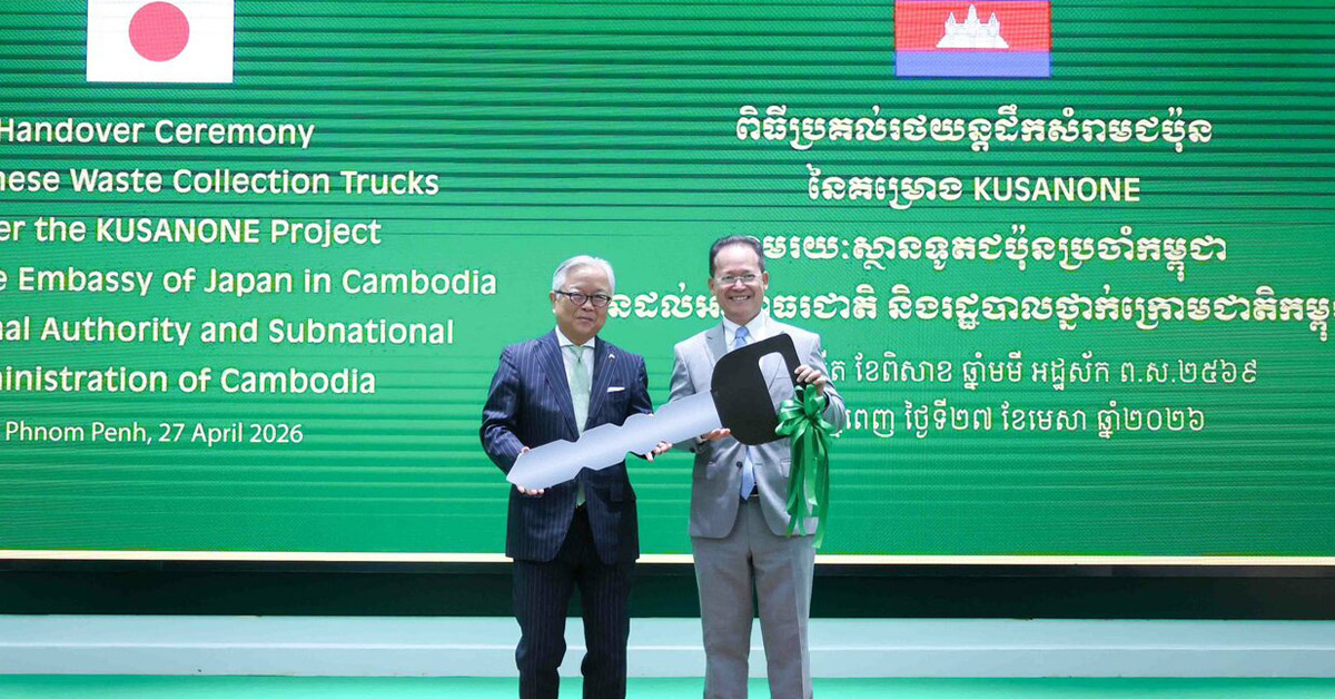 (រាជធានីភ្នំពេញ)៖ តាមការចុះផ្សាយពី អគ្គនាយកដ្ឋានវិទ្យុជាតិកម្ពុជា នៅថ្ងៃទី ២៧ ខែមេសា ឆ្នាំ ២០២៦ នេះ បានឱ្យដឹងថា រដ្ឋាភិបាលជប៉ុន បានផ្តល់រថយន្តដឹកសំរាមបន្ថែមចំនួន ១០គ្រឿងទៀត ដល់ក្រសួងបរិស្ថានកម្ពុជា។ នេះជាជំនួយលើកទីបី ដែលធ្វើឱ្យចំនួនរថយន្តជាជំនួយរបស់ជប៉ុនសរុបកើនឡើងចំនួន ៣០គ្រឿង។ រថយន្តទាំងនេះ ត្រូវបានប្រគល់ជាផ្លូវការ ដោយឯកឧត្តម Ueno Atsushi ឯកអគ្គរាជទូតជប៉ុនប្រចាំកម្ពុជា។