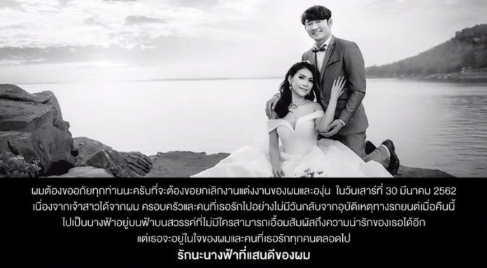 គ្រានោះរឿងរ៉ាវស្នេហារបស់លោកត្រូវបានគេចែករំលែកពេញបណ្តាញសង្គម នូវរូបជាមួយសារដែលលោកបង្ហោះថា៖ «ខ្ញុំសុំអភ័យទោសចំពោះបងប្អូនគ្រប់គ្នា ដែលត្រូវប្រាប់អ្នកទាំងអស់គ្នាថា ខ្ញុំសុំលុបចោលពិធីមង្គលការនៅថ្ងៃសៅរ៍ទី៣០ ខែមីនា ដោយកូនក្រមុំដ៏ស្រស់ស្អាតរបស់ខ្ញុំបានលាចាកលោកទៅចោលអ្នករាល់គ្នា ក្រុមគ្រួសារ និងមនុស្សដែលនាងស្រលាញ់បាត់ហើយ ព្រោះនាងបានជួបឧប្បត្តិហេតុគ្រោះថ្នាក់ចរាចរណ៍។ ហេតុដូចនេះពិធីមង្គលការមិនអាចបន្តបានទៀតនោះទេ ពេលនេះនាងទៅបានសុខហើយ។ ទោះបីជានាងបានចាកចេញពិតមែន តែនាងនៅតែស្ថិតក្នុងដួងចិត្តខ្ញុំ និងអ្នកដែលស្រលាញ់រាប់អាននាងជារៀងរហូតទៅ។ ស្រលាញ់អូនខ្លាំងណាស់ ទេពអប្សរដ៏សែនល្អរបស់បង»។ លើសពីនេះលោកក៏បានហាត់សមច្រៀងចម្រៀងសម្រាប់ជូនភរិយារបស់លោកនៅថ្ងៃពិធីមង្គលការផងដែរ គឺបទ “ของขวัญ” ដែលមានន័យថា កាដូ ឬ អំណោយ៕