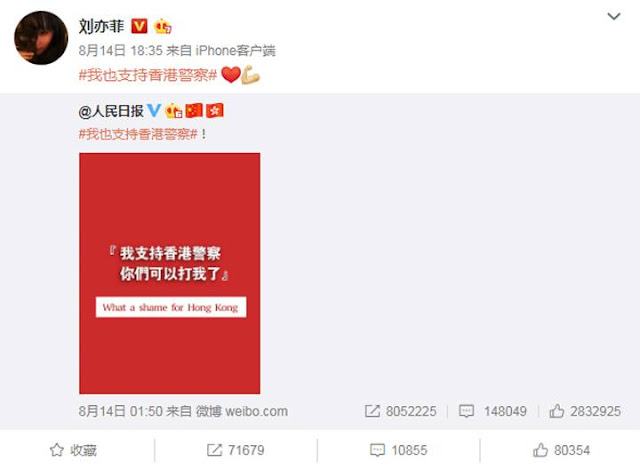 យោងតាមកាសែត Beijing People’s People’s Daily បានឱ្យដឹងថា ក្នុងសារមួយនោះនាង Liu Yifei បានសរសេរថា៖ «ខ្ញុំក៏គាំទ្រដល់ប៉ូលីសហុងកុង អ្នកអាចវាយខ្ញុំបានពេលនេះ»។ គួរឱ្យដឹងដែរថា ការតវ៉ាបានចាប់ផ្តើមកាលពី ១០សប្តាហ៍មុន ដែលក្រុមបាតុករបានប្រឆាំងនឹងច្បាប់ធ្វើបត្យាប័ន ដែលជាច្បាប់អនុញ្ញាឱ្យឧក្រិដ្ឋជនត្រូវបញ្ជូនទៅកាត់ទោសនៅឯចិនដីគោក ប៉ុន្តែវាបានអូសបន្លាយទៅជាការអំពាវនាវឱ្យមានលទ្ធិប្រជាធិបតេយ្យកាន់តែទូលំទូលាយនៅក្នុងទីក្រុងនេះ៕
