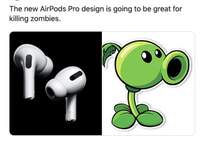 សម្រាប់អ្នកប្រើប្រាស់បណ្ដាញសង្គមវិញបាននាំគ្នាប្រដូចរូងរាងរបស់ AirPods Pro ទៅនឹងវត្ថុជាច្រើន ដោយអ្នកខ្លះថាដូចជាតួរអង្គតុក្កតា Pokémon Bellsproutt ដូចមាស៊ីនសម្ងួតសក់ ដូចរុក្ខជាតិ Peashooter នៅក្នុងហ្គេមសម្រាប់បាញ់ Zombies ឬដូចក្បាលផ្កាឈូកសម្រាប់ងូតទឹកជាដើម។ លោកអ្នកអាចទស្សនារូបនៃការប្រៀបប្រដូច AirPods Pro ទៅនឹងវត្ថុផ្សេងៗក្នុងន័យបែបលេងសើចដូចខាងក្រោមនេះ៖
