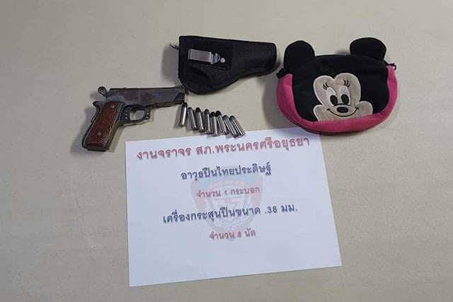 ថៃ៖ បុរសជនជាតិថៃម្នាក់ត្រូវបានរកឃើញថា មានកាំភ្លើងខ្លី និងគ្រាប់កាំភ្លើងជាប់ខ្លួន នៅពេលមកដល់ត្រង់ចំនុចត្រួតពិនិត្យចរាចរណ៍មួយ។ តាមសម្ដីរបស់ប៉ូលីសថៃនិយាយថា បុរសម្នាក់នោះបានសារភាពថាខ្លួនកំពុងជិះតាមផ្លូវ ដើម្បីទៅសម្លាប់ប្រពន្ធ និងសាហាយរបស់នាង ដែលនៅផ្សារទំនើបក្បែរនោះ។ បុរសម្នាក់នោះមានឈ្មោះថា Somkhid Ruennangyaem អាយុ ៤៥ឆ្នាំ ត្រូវគេឃាត់ខ្លួនបាននៅក្បែរស្ពាន Naresuan ក្នុងឃុំ Pailing ស្រុក Phra Nakhon Si Ayutthaya នៅម៉ោងប្រហែល ១១ថ្ងៃត្រង់ កាលពីថ្ងៃអង្គារ។ បុរសនោះត្រូវបានគេរកឃើញថា មានកាំភ្លើងដែលមិនបានចុះបញ្ជីនោះទេ បូករួមគ្រាប់កាំភ្លើង ៧គ្រាប់ទៀត នៅក្រោមកែបម៉ូតូរបស់គាត់។