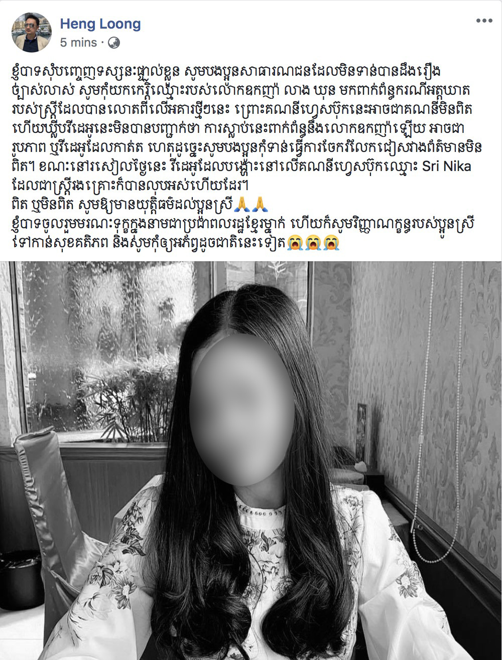 ពាក់ព័ន្ធនឹងបញ្ហានេះ លោក ហេង ឡុង ដែលជាប្រធានសមាគមន៍មិត្តសិល្បៈស្ម័គ្រចិត្តជួយសង្គម ក៏បានបញ្ចេញទស្សនៈផ្ទាល់ខ្លួនថា៖ “ខ្ញុំបាទសុំបញ្ចេញទស្សនៈផ្ទាល់ខ្លួន សូមបងប្អូនសាធារណជនដែលមិនទាន់បានដឹងរឿងច្បាស់លាស់ សូមកុំយកកេរ្ដិ៍ឈ្មោះរបស់លោកឧកញ៉ា លាង ឃុន មកពាក់ព័ន្ធករណីអត្តឃាតរបស់ស្រ្តីដែលបានលោតពីលើអគារថ្មីៗនេះ ព្រោះគណនីហ្វេសប៊ុកនេះអាចជាគណនីមិនពិត ហើយឃ្លីបវីដេអូនេះមិនបានបញ្ជាក់ថា ការស្លាប់នេះពាក់ព័ន្ធនឹងលោកឧកញ៉ាឡើយ អាចជារូបភាព ឬវីដេអូដែលកាត់ត ហេតុដូច្នេះសូមបងប្អូនកុំទាន់ធ្វើការចែករំលែកជៀសវាងព័ត៌មានមិនពិត។ ខណៈនៅរសៀលថ្ងៃនេះ វីដេអូដែលបង្ហោះនៅលើគណនីហ្វេសប៊ុកឈ្មោះ Sri Nika ដែលជាស្រ្តីរងគ្រោះក៏បានលុបអស់ហើយដែរ។ ពិត ឬមិនពិត សូមឱ្យមានយុត្តិធម៌ដល់ប្អូនស្រី ខ្ញុំបាទចូលរួមមរណៈទុក្ខក្នុងនាមជាប្រជាពលរដ្ឋខ្មែរម្នាក់ ហើយក៏សូមវិញ្ញាណក្ខន្ធរបស់ប្អូនស្រីទៅកាន់សុខគតិភព និងសូមកុំឲ្យអភ័ព្វដូចជាតិនេះទៀត”៕