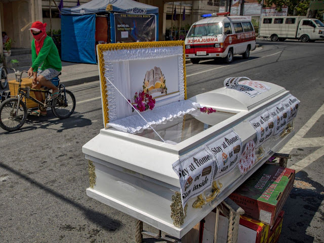 ហើយអ្វីដែលកាន់តែប្លែកនោះគឺនៅតាមផ្លូវមានដាក់មឈូស ជាមួយនឹងពាក្យស្លោកថា «នៅផ្ទះ ឬនៅក្នុងនេះ» (stay at home or stay inside) ដើម្បីដាស់តឿនមនុស្សគ្រប់គ្នាពីហានិភ័យនៃវីរុស COVID-19 ។ មឈូសអាចត្រូវបានរកឃើញនៅតាមដងផ្លូវ និងនៅប៉ុស្តិ៍ត្រួតពិនិត្យនៅទូទាំងទីក្រុងទាំងអស់ ហើយវាត្រូវបានគេចាត់ទុកថា ជាអ្វីដែលមានតែលោក Rodrigo Duterte ប៉ុណ្ណោះអាចនឹកធ្វើបាន។ ប៉ុន្តែទោះជាមានការរឹតត្បឹតខ្លាំងយ៉ាងណា ប្រទេសនេះនៅតែស្ថិតក្នុងលំដាប់ទី២ ដែលមានការឆ្លងច្រើនបំផុតនៅអាស៉ីអាគ្នេយ៍ ដោយមានករណីសរុបជាង ២,០០០នាក់ ខណៈមានអ្នកស្លាប់ ៨៨នាក់៕