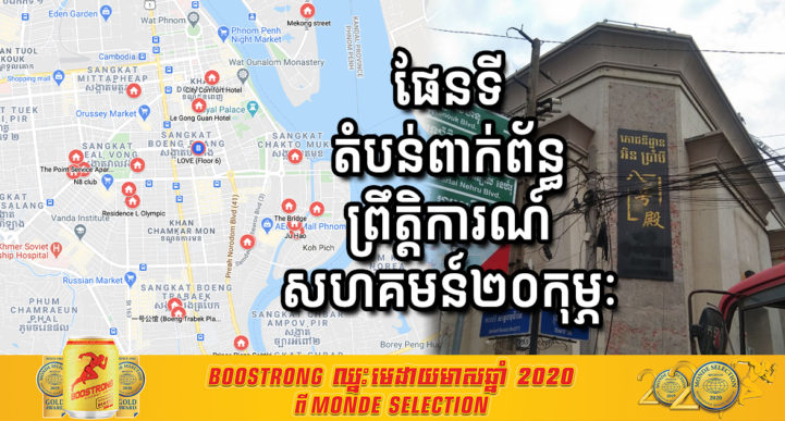 កាលពីប៉ុន្មានម៉ោងមុននេះ នាយកដ្ឋានប្រយុទ្ធនឹងជំងឺឆ្លង CDC បានធ្វើការបង្ហាញពីទីតាំងអមជាមួយនឹងផែនទី នៃទីតាំងទាំង២៣កន្លែង ដែលពាក់ព័ន្ធនឹងព្រឹត្តិការណ៍ សហគមន៍ ២០កុម្ភ: ដើម្បីឲ្យបងប្អូនប្រជាពលរដ្ឋមានការងាយស្រួលក្នុងការដឹងពីកន្លែងដែលមានហានិភ័យ និងធ្វើការបង្ការខ្លួនផងដែរ។ ទីតាំង និងផែនទី ទាំង២៣កន្លែងនោះមាន៖ 1. ក្លិប N8 សង្កាត់ទួលស្វាយព្រៃ, 2. Casa By Meridian កោះពេជ្រ, 3. Le Gong Guan Hotel សង្កាត់ផ្សារថ្មីទី៣, 4. City Confort 1 សង្កាត់បឹងព្រលឹត, 5.