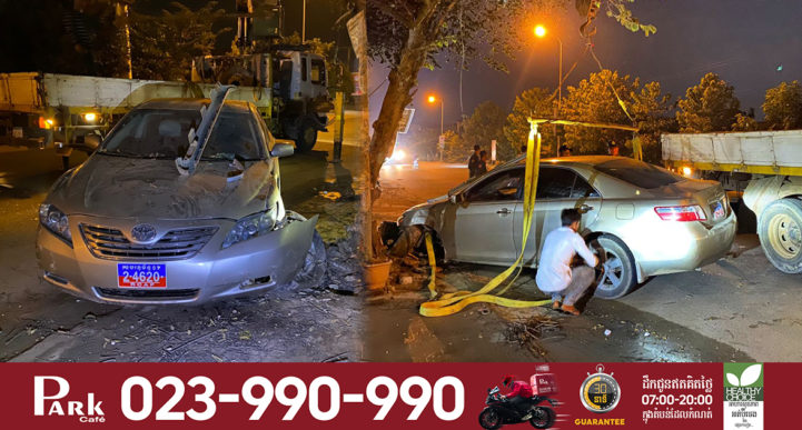 ក្រុងតាខ្មៅ ៖ រថយន្តកាម៉ារីហាយប្រ៊ីតមួយគ្រឿង ពាក់ស្លាកលេខខេមរភូមិន្ទ 01 2-4620 បើកបោះពួយលឿនពេក ស្រាប់តែជ្រុលចង្កូតទៅបុកផ្ទប់ដើមឈើ និងបង្គោលភ្លើងបំភ្លឺផ្លូវ បាក់កាឡេកង់មុខ បើកទៅមុខលែងរួច ។ ហេតុការណ៍គ្រោះថ្នាក់ចរាចរណ៍នេះ កើតឡើងកាលពីវេលាម៉ោងជាង១០យប់ ថ្ងៃចន្ទ ទី២៥ ខែមករា ឆ្នាំ២០២១នេះ នៅត្រង់ចំណុចជិតស្នាក់ការប៉ុស្តិ៍កំពង់សំណាញ់ ផ្លូវលេខ១០៥ ភូមិព្រែករាំង សង្កាត់កំពង់សំណាញ់ ក្រុងតាខ្មៅ ខេត្តកណ្តាល ។ រថយន្តបង្កម៉ាកកាម៉ារីហាយប្រ៊ីត (CAMRY HYBRID) ពណ៌ស្ករ ពាក់ស្លាកលេខខេមរភូមិន្ទ(ខម)01 2-4620 បើកបរដោយបុរសមិនស្គាល់អត្តសញ្ញាណម្នាក់ ។ ប្រភពពីសមត្ថកិច្ចនគរបាលប៉ុស្តិ៍កំពង់សំណាញ់បានប្រាប់ឲ្យក្រុមការងារខ្មែរណូតដឹងថា