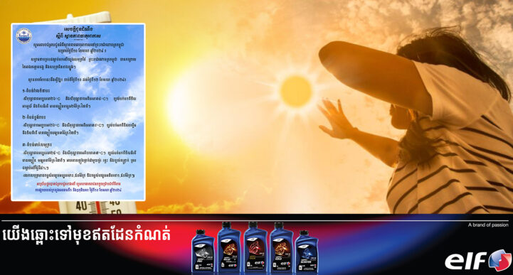 រាជធានីភ្នំពេញ៖ យោងតាមការចុះផ្សាយរបស់ ក្រសួងធនធានទឹក និងឧតុនិយម បានចេញសេចក្ដីជូនដំណឹង អំពីស្ថានភាពធាតុអាកាសនៅព្រះរាជាណាចក្រកម្ពុជាសម្រាប់ថ្ងៃទី១១ ខែមេសា ឆ្នាំ២០២៤។ ក្រសួងធនធានទឹក បានឱ្យដឹងថា សម្ពាធទាបគ្របដណ្ដប់មកលើឈូងសមុទ្រថៃ ព្រះរាជាណាចក្រកម្ពុជា ភាគកណ្តាលនៃអាងទន្លេមេគង្គ និងសមុទ្រចិនខាងត្បូង។ ស្ថានភាពបែបនេះនឹងធ្វើឱ្យចាប់ពីថ្ងៃទី១១ ដល់ថ្ងៃទី១៣ ខែមេសាឆ្នាំ២០២៤៖ ១. តំបន់វាលទំនាប៖ -សីតុណ្ហភាពអប្បបរមា២៦°C និងសីតុណ្ហភាពអតិបរមា៣៧°C។ ខ្យល់បក់មកពីទិសអាគ្នេយ៍ និងទិសនិរតី មានល្បឿនមធ្យម២ម៉ែត្រ/វិនាទី។ ២.តំបន់ខ្ពង់រាប៖ -សីតុណ្ហភាពអប្បបរមា២៦°C និងសីតុណ្ហភាពអតិបរមា៣៩°C។ ខ្យល់បក់មកពីទិសបស្ចិម និងទិសនិរតី មានល្បឿនមធ្យម២,៥ម៉ែត្រ/វិនាទី។ ៣.តំបន់មាត់សមុទ្រ៖ -សីតុណ្ហភាពអប្បបរមា២៥°C និងសីតុណ្ហភាពអតិបរមា៣៥°C។ ខ្យល់បក់មកពីទិសនិរតី