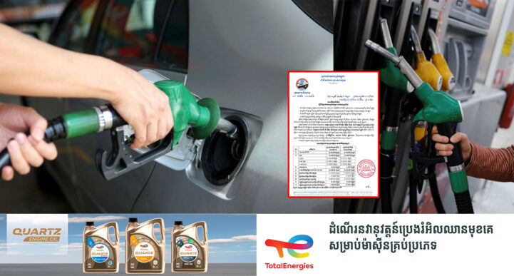 រាជធានីភ្នំពេញ៖ នៅថ្ងៃទី២១ ខែមីនា ឆ្នាំ២០២៤ យោងតាមការចុះផ្សាយរបស់ ក្រសួងពាណិជ្ជកម្ម បានចេញសេចក្តីជូនដំណឹង ប្រកាសពីតម្លៃលក់រាយប្រេងឥន្ធនៈ នៅតាមស្ថានីយនានាដោយចាប់ពីថ្ងៃទី២១ ដល់ថ្ងៃទី៣១ ខែមីនា ឆ្នាំ២០២៤ ត្រូវលក់សាំងធម្មតាតម្លៃ ៤,៣៥០រៀល និងម៉ាស៊ូតត្រូវលក់ ៤,១៥០រៀល ក្នុង១លីត្រ។ ហើយតម្លៃនេះបើធៀបនឹងតម្លៃ ដែលក្រសួងបានកំណត់កាលពី១០ថ្ងៃមុន មានការឡើងបន្តិចបន្តួច ដោយកាលពី១០ថ្ងៃមុន សម្រាប់ប្រេងសាំងធម្មតាគឺមានតម្លៃ ៤,២៥០រៀលក្នុងមួយលីត្រ មានន័យថាឡើង ១០០រៀលក្នុងមួយលីត្រ និងតម្លៃប្រេងសាំងម៉ាស៊ូតមានតម្លៃ ៤,១៥០រៀល មានន័យថាតម្លៃដដែល ៕ ប្រភព៖ ក្រសួងពាណិជ្ជកម្ម Ministry of Commerce