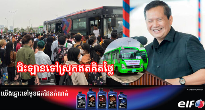 រាជធានីភ្នំពេញ៖ យោងតាមការចុះផ្សាយរបស់ ក្រសួងព័ត៌មាន បានឱ្យដឹងថា សម្ដេចមហាបវរធិបតី ហ៊ុន ម៉ាណែត នាយករដ្ឋមន្ដ្រីកម្ពុជា បានស្នើឱ្យសាលារាជធានីភ្នំពេញ ត្រៀមរថយន្តក្រុង ដើម្បីដឹកជញ្ជូនប្រជាពលរដ្ឋពីរាជធានីភ្នំពេញ ទៅស្រុកកំណើតនៅតាមបណ្ដាខេត្តនានា ក្នុងឱកាសពិធីបុណ្យចូលឆ្នាំថ្មីប្រពៃណីជាតិខ្មែរ នាពេលខាងមុខនេះ ដោយឥតគិតថ្លៃ។ នាឱកាសអញ្ជើញបើកការដ្ឋាន សាងសង់ស្ពានឆ្លងកាត់ទន្លេបាសាក់ «ចាក់អង្រែក្រោម-ព្រែកប្រា» នាព្រឹកថ្ងៃ១៩ កុម្ភៈ សម្ដេចធិបតីមានប្រសាសន៍ថា «តិចទៀត ជិតដល់ចូលឆ្នាំខ្មែរហើយ អីចឹងត្រៀមមធ្យោបាយដឹកជញ្ជូន ដឹកបងប្អូនយើងពីភ្នំពេញទៅស្រុកដូចរាល់ឆ្នាំ ហើយកុំភ្លេចទឹកសុទ្ធថែមឱ្យគាត់ផង»។ សូមជម្រាបជូនថា សាលារាជធានីភ្នំពេញ ជារៀងរាល់ឆ្នាំតែងតែត្រៀមរថយន្តក្រុងសម្រាប់ដឹកប្រជាពលទៅលេងស្រុកកំណើតដោយឥតគិតថ្លៃ ក្នុងឱកាស បុណ្យភ្ជុំបិណ្ឌ និងបុណ្យចូលឆ្នាំខ្មែរ ដើម្បីសម្រួលដល់ការចំណាយក្នុងការធ្វើដំណើរ ក៏ដូចជាទប់ស្កាត់ការដំឡើងថ្លៃឈ្នូល