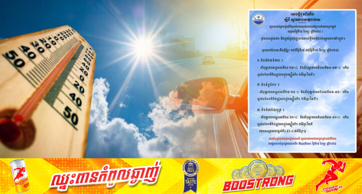 រាជធានីភ្នំពេញ៖ យោងតាមការចុះផ្សាយរបស់ ក្រសួងធនធានទឹក និងឧតុនិយម បានចេញសេចក្ដីជូនដំណឹង អំពីស្ថានភាពធាតុអាកាសនៅព្រះរាជាណាចក្រកម្ពុជាសម្រាប់ថ្ងៃទី១៥ ខែកុម្ភៈ ឆ្នាំ២០២៤។ ជ្រលងសម្ពាធទាប និងខ្យល់មូសុងឦសានមានឥទ្ធិពលនិងបក់ខ្សោយមកលើកម្ពុជា។ ស្ថានភាពបែបនេះនឹងធ្វើឱ្យ ចាប់ពីថ្ងៃទី១៥ ដល់ថ្ងៃទី១៧ ខែកុម្ភៈ ឆ្នាំ២០២៤៖ ១-តំបន់វាលទំនាប៖ ⁃ សីតុណ្ហភាពអប្បបរមាពី២៤-២៧°C និងសីតុណ្ហភាពអតិបរមាពី៣៣-៣៧°C ហើយខ្យល់បក់មកពីទិសឦសាន ក្នុងល្បឿនពី ១-២ម៉ែត្រ/វិនាទី។ ២-តំបន់ខ្ពង់រាប៖ ⁃ សីតុណ្ហភាពអប្បបរមាពី២៣-២៥°C និងសីតុណ្ហភាពអតិបរមាពី៣៣-៣៦°C ហើយខ្យល់បក់មកពីទិសឦសាន ក្នុងល្បឿនពី១-២ម៉ែត្រ/វិនាទី។ ៣-តំបន់មាត់សមុទ្រ៖ ⁃ សីតុណ្ហភាពអប្បបរមាពី២៤-២៦°C និងសីតុណ្ហភាពអតិបរមាពី៣៣-៣៦°C ហើយខ្យល់បក់មកពីទិសឦសានក្នុងល្បឿនពី១-២ម៉ែត្រ/វិនាទី ⁃