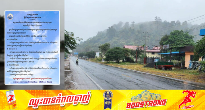 រាជធានីភ្នំពេញ៖ យោងតាមការចុះផ្សាយរបស់ ក្រសួងធនធានទឹក និងឧតុនិយម បានចេញសេចក្ដីជូនដំណឹង អំពីស្ថានភាពធាតុអាកាសនៅព្រះរាជាណាចក្រកម្ពុជាសម្រាប់ថ្ងៃទី៥ ខែមករា ឆ្នាំ២០២៤។ ក្រសួងធនធានទឹក បានឱ្យដឹងថា ទ្រនុងនៃសម្ពាធខ្ពស់នៅលើប្រទេសចិនមានឥទ្ធិពលខ្សោយគ្របដណ្តប់មកលើតំបន់ខ្ពង់រាបកម្ពុជា ជាមួយនឹងខ្យល់មូសុងឦសានមធ្យម។ ស្ថានភាពបែបនេះនឹងធ្វើឱ្យ៖ ចាប់ពីថ្ងៃទី៥ ដល់ថ្ងៃទី៧ ខែមករា ឆ្នាំ២០២៤៖ ១-តំបន់វាលទំនាប៖ ⁃ សីតុណ្ហភាពអប្បបរមាពី២៣-២៥°C និងសីតុណ្ហភាពអតិបរមាពី៣៣-៣៥°C ហើយខ្យល់បក់មកពីទិសឦសាន ក្នុងល្បឿនពី២-៤ម៉ែត្រ/វិនាទី។ ២-តំបន់ខ្ពង់រាប៖ ⁃ សីតុណ្ហភាពអប្បបរមាពី១៩-២៤°C សីតុណ្ហភាពអតិបរមាពី៣២-៣៤°C ហើយខ្យល់បក់មកពីទិសឦសាន ក្នុងល្បឿនពី៣-៥ម៉ែត្រ/វិនាទី ⁃ នៅថ្ងៃទី៥-៦ ខែមករា ខេត្តមណ្ឌលគិរី រតនគិរី