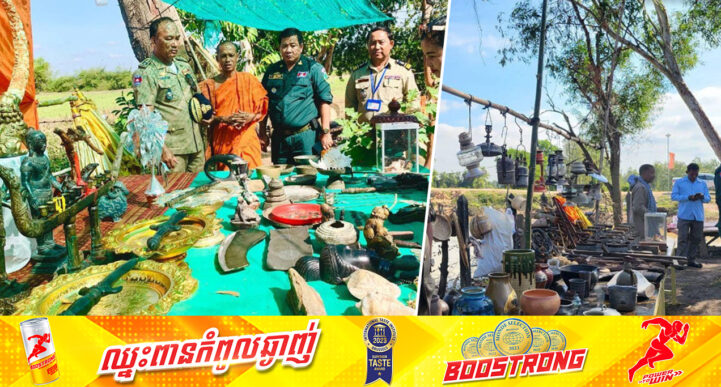 ខេត្តតាកែវ៖ យោងតាមការចុះផ្សាយរបស់ អគ្គស្នងការដ្ឋាននគរបាលជាតិ បានឱ្យដឹងថា នៅព្រឹកថ្ងៃទី០៤ ខែធ្នូ ឆ្នាំ២០២៣ម្សិលមិញនេះ ឯកឧត្តម ឧត្តមសេនីយ៍ឯក លី ឡាយ ប្រធាននាយកដ្ឋាន បានដឹកនាំកម្លាំងនាយកដ្ឋាននគរបាលការពារបេតិកភណ្ឌ ទៅសហការជាមួយការិយាល័យនគរបាលការពារបេតិកភណ្ឌ នៃស្នងការដ្ឋាននគរបាលខេត្តតាកែវ និងក្រុមការងារជំនាញនៃមន្ទីរវប្បធម៌និងវិចិត្រសិល្បៈខេត្ត អាជ្ញាធរដែនដីគ្រប់លំដាប់ថ្នាក់នៃស្រុកសំរោងសរុបចំនួន ២៣នាក់ ចុះទៅពិនិត្យចេតិយ និងវត្ថុបុរាណ ដែលស្ថិតនៅទីតាំង០១កន្លែង នៅក្នុងស្រុកសំរោង ខេត្តតាកែវ។ ក្រុមការងារបានពិនិត្យរកឃើញនូវវត្ថុបុរាណចំនួន ៨មុខផ្សេងៗ រួមមាន៖ ពូថៅថ្មចំនួន ០៣បំណែក,អង្រែចំនួន ០១, កុឡាភាជន៍ចំនួន ០៣ បំណែក និងបល្ល័ង្គធ្វើពីស្ពាន់ចំនួន ០១