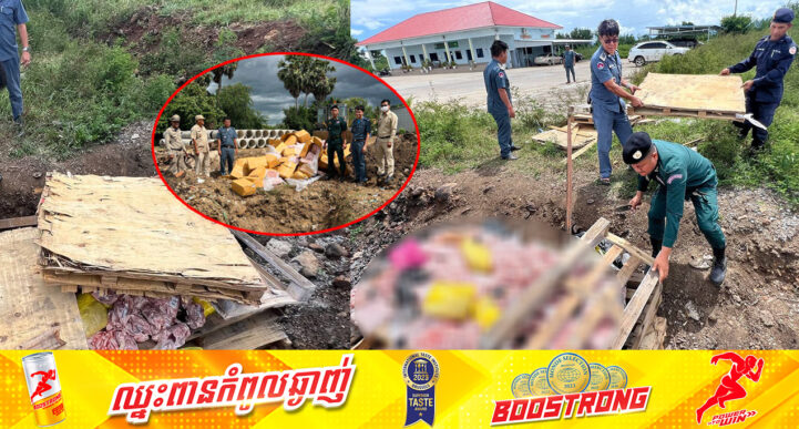 ខេត្តបាត់ដំបង៖ យោងតាមការចុះផ្សាយរបស់ អគ្គនាយកដ្ឋានគយនិងរដ្ឋាករកម្ពុជា បានឱ្យដឹងថា ចាប់ថ្ងៃទី២៨ ដល់ថ្ងៃទី២៩ ខែសីហា ឆ្នាំ២០២៤ អង្គភាពគយ និងរដ្ឋាករក្រោមឱវាទអគ្គនាយកដ្ឋានគយនិងរដ្ឋាករកម្ពុជា បានសហការជាមួយសមត្ថកិច្ចពាក់ព័ន្ធ ធ្វើការបង្ក្រាបនិងដុតកម្ទេចទំនិញហាមឃាត់នាំចូល ជាបំណែកសាច់មាន់ និងសាច់ទាបង្កកចំនួន ៣ករណី ស្មើនឹង ៤ ២៣៩ គីឡូក្រាម ដូចខាងក្រោម៖ ១-ចុងស្លាបមាន់ និងគ្រឿងក្នុងមាន់បង្កក ២៣៩គីឡូក្រាម ត្រូវបានបង្ក្រាបដោយមន្ត្រីការិយាល័យគយនិងរដ្ឋាករដូង នៃសាខាគយនិងរដ្ឋាករខេត្តបាត់ដំបង សហការជាមួយមន្ត្រីនគរបាល នាថ្ងៃទី២៨ ខែសីហា ឆ្នាំ២០២៤ នៅពេលឈ្មួញលួចលាក់បង្កប់ក្នុងទំនិញដទៃ នាំចូលពីប្រទេសថៃ តាមផែស្ងួតដូង។ ២-ជើងទាបង្កក ១