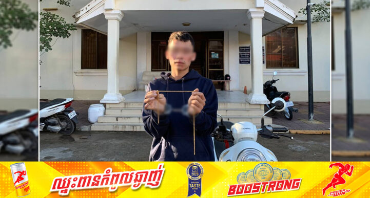 រាជធានីភ្នំពេញ៖ យោងតាមការចុះផ្សាយរបស់ ស្នងការដ្ឋាននគរបាលរាជធានីភ្នំពេញ បានឱ្យដឹងថា នៅថ្ងៃទី២៤ ខែតុលា ឆ្នាំ២០២៣ វេលាម៉ោងប្រហែល ០៦៖២០នាទីព្រឹក កម្លាំងផ្នែកជំនាញ នៃអធិការដ្ឋាននគរបាលខណ្ឌទួលគោក បានធ្វើការបង្ក្រាបឃាត់ខ្លួនជនសង្ស័យម្នាក់ ពាក់ព័ន្ធករណីឆក់ខ្សែក ប្រព្រឹត្តនៅចំណុចមុខអ៉ីម៉ាន់នីវេរលុយ មានទីតាំងផ្ទះលេខ៨១ ផ្លូវលេខ៥៩៨ ក្រុមទី២៥ ភូមិ៥ សង្កាត់បឹងកក់ទី២ ខណ្ឌទួលគោក រាជធានីភ្នំពេញ។ ជនសង្ស័យឈ្មោះ សុខា សុវណ្ណមុន្នីឆេង ហៅ ឆេង ភេទប្រុស ជនជាតិខ្មែរ មុខរបរ មិនពិតប្រាកដ ស្នាក់នៅមិនពិតប្រាកដ (មានសារធាតុញៀន)។ វត្ថុតាងចាប់យក៖ ម៉ូតូម៉ាក