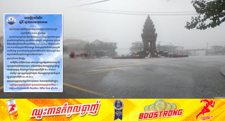 រាជធានីភ្នំពេញ៖ នៅថ្ងៃួទី២៤ ខែតុលា ឆ្នាំ២០២៣ យោងតាមការចុះផ្សាយរបស់ ក្រសួងធនធានទឹក និងឧតុនិយម បានចេញសេចក្ដីជូនដំណឹង អំពីស្ថានភាពធាតុអាកាសនៅព្រះរាជាណាចក្រកម្ពុជាសម្រាប់ថ្ងៃទី២៤ ខែតុលា ឆ្នាំ២០២៣។ ព្រះរាជាណាចក្រកម្ពុជាទទួលឥទ្ធិពលពីប្រព័ន្ធសម្ពាធទាប ដែលអូសបន្លាយពីភាគកណ្ដាលប្រទេសថៃទៅសមុទ្រចិនខាងត្បូង ឆ្លងកាត់ពីលើប្រទេសកម្ពុជា។ ក្នុងអំឡុងពេលនេះ ខ្យល់មូសុងនិរតីបានបង្កើនកម្លាំងបក់មកលើសមុទ្រអាន់ដាមែន (Andaman Sea) និងឈូងសមុទ្រថៃ។ ខណៈនេះមានលំហូរខ្យល់បក់ពីទិសខាងត្បូងនាំមកជាមួយនូវសំណើមពីឈូងសមុទ្រថៃ មកលើតំបន់ឆ្នេរ ស្របពេលដែលលំហូរខ្យល់បក់មកពីទិសខាងកើត និងទិសអាគ្នេយ៍ នាំមកជាមួយសំណើមពីសមុទ្រចិនខាងត្បូងមកលើប្រទេសកម្ពុជា។ ស្ថានភាពបែបនេះនឹងធ្វើឱ្យ៖ – ចាប់ពីថ្ងៃទី២៤ ដល់ថ្ងៃទី២៨ ខែតុលា នៅតាមបណ្ដាខេត្តមួយចំនួននៅតំបន់មាត់សមុទ្រ និងបណ្តាខេត្តមួយចំនួនក្នុងតំបន់ទំនាបកណ្តាល រួមទាំងរាជធានីភ្នំពេញ នឹងមានភ្លៀងធ្លាក់ក្នុងកម្រិតបង្គួរ លាយឡំជាមួយផ្គររន្ទះ