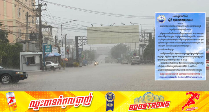 រាជធានីភ្នំពេញ៖ នៅថ្ងៃទី២៣ ខែតុលា ឆ្នាំ២០២៣ យោងតាមការចុះផ្សាយរបស់ ក្រសួងធនធានទឹក និងឧតុនិយម បានចេញសេចក្ដីជូនដំណឹង អំពីស្ថានភាពធាតុអាកាសនៅព្រះរាជាណាចក្រកម្ពុជាសម្រាប់ថ្ងៃទី២៣ ខែតុលា ឆ្នាំ២០២៣។ ក្រសួងធនធានទឹក បានឱ្យដឹងថា ប្រព័ន្ធសម្ពាធទាប ដែលកំពុងមាននៅលើឈូងសមុទ្របេងកាល (Bay of Bengal) គេរំពឹងថានឹងវិវត្តទៅជាព្យុះត្រូពិក និងខ្យល់មូសុងនិរតីនៅលើសមុទ្រអាដាំមែន (Andaman Sea) នឹងគ្របដណ្តប់លើឈូងសមុទ្រថៃ និងវិវត្តទៅជាប្រព័ន្ធសម្ពាធទាប។ ខណៈនេះ ខ្យល់មូសុងភាគខាងត្បូងនិងខាងកើត បក់នាំសំណើមក្នុងកម្រិតមធ្យមមកលើតំបន់ខ្ពង់រាប តំបន់ទំនាបកណ្តាល និងតំបន់មាត់សមុទ្រនៃព្រះរាជាណាចក្រកម្ពុជា។ ស្ថានភាពបែបនេះនឹងធ្វើឱ្យ៖ – ចាប់ពីថ្ងៃទី២៣ ដល់ថ្ងៃទី២៦ ខែតុលា