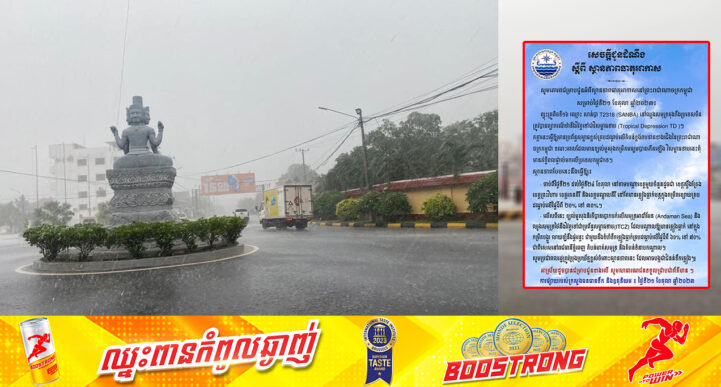 រាជធានីភ្នំពេញ៖ នៅថ្ងៃទី២១ ខែតុលា ឆ្នាំ២០២៣ យោងតាមការចុះផ្សាយរបស់ ក្រសួងធនធានទឹក និងឧតុនិយម បានចេញសេចក្ដីជូនដំណឹង អំពីស្ថានភាពធាតុអាកាសនៅព្រះរាជាណាចក្រកម្ពុជាសម្រាប់ថ្ងៃទី២១ ខែតុលា ឆ្នាំ២០២៣។ ក្រសួងធនធានទឹក បានឱ្យដឹងថា ព្យុះត្រូពិចទី១៦ ឈ្មោះ សាន់បា T2316 (SANBA) នៅឈូងសមុទ្រតុងកឹងប្រទេសចិន ត្រូវបានព្យាករណ៍ថានឹងវិវត្តទៅជាវិសម្ពាធទាប (Tropical Depression TD) ។ កត្តានេះធ្វើឱ្យមានប្រព័ន្ធសម្ពាធខ្ពស់គ្របដណ្តប់លើតំបន់ខ្ពង់រាបភាគខាងជើងនៃព្រះរាជាណាចក្រកម្ពុជា ខណៈពេលដែលមានខ្យល់មូសុងកម្រិតមធ្យមបានកើតឡើង វិសម្ពាធទាបនេះពុំមានឥទ្ធិពលផ្ទាល់មកលើប្រទេសកម្ពុជាទេ។ ស្ថានភាពបែបនេះនឹងធ្វើឱ្យ៖ ចាប់ពីថ្ងៃទី២១ ដល់ថ្ងៃទី២៤ ខែតុលា នៅតាមបណ្ដាខេត្តមួយចំនួនដូចជា ខេត្តស្ទឹងត្រែង ខេត្តព្រះវិហារ